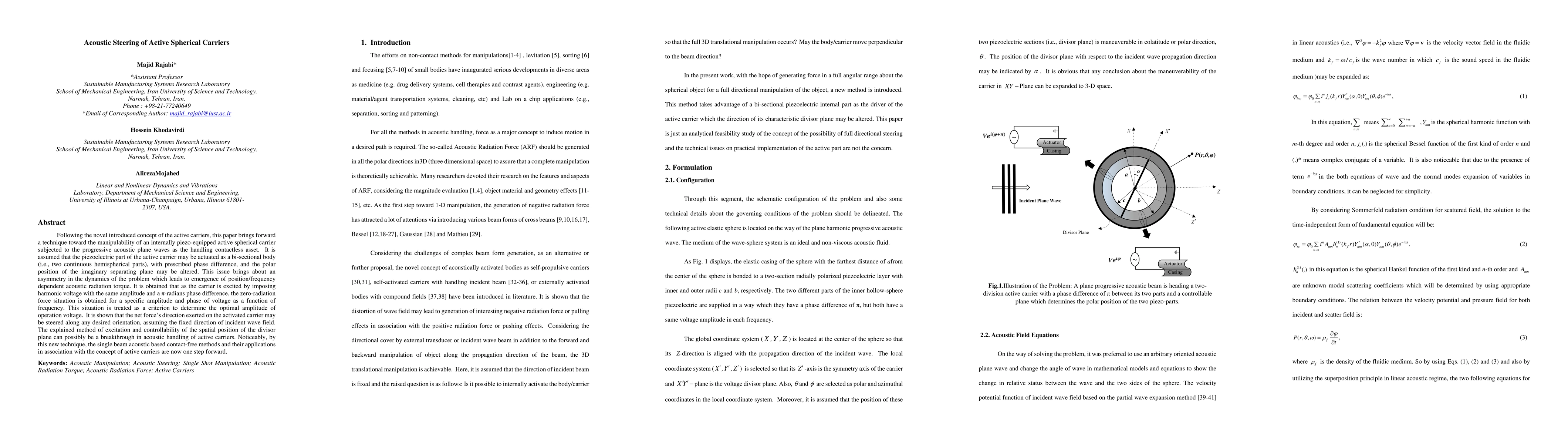 Following the novel introduced concept of the active carriers, this paper brings forward a technique toward the manipulability of an internally piezo-equipped active spherical carrier subjected to the progressive acoustic plane waves as the handling contactless asset. It is assumed that the piezoelectric part of the active carrier may be actuated as a bi-sectional body (i.e., two continuous hemispherical parts), with prescribed phase difference, and the polar position of the imaginary separating plane may be altered. This issue brings about an asymmetry in the dynamics of the problem which leads to emergence of position/frequency dependent acoustic radiation torque. It is obtained that as the carrier is excited by imposing harmonic voltage with the same amplitude and a $\pi$-radians phase difference,the zero-radiation force situation is obtained for a specific amplitude and phase of voltage as a function of frequency. This situation is treated as a criterion to determine the optimal amplitude of operation voltage. It is shown that the net force's direction exerted on the activated carrier may be steered along any desired orientation, assuming the fixed direction of the incident wave field. The explained method of excitation and controllability of the spatial position of the divisor plane can possibly be a breakthrough in acoustic handling of active carriers. Noticeably, by this new technique, the single beam acoustic based contact-free methods and their applications in association with the concept of active carriers are now one step forward.