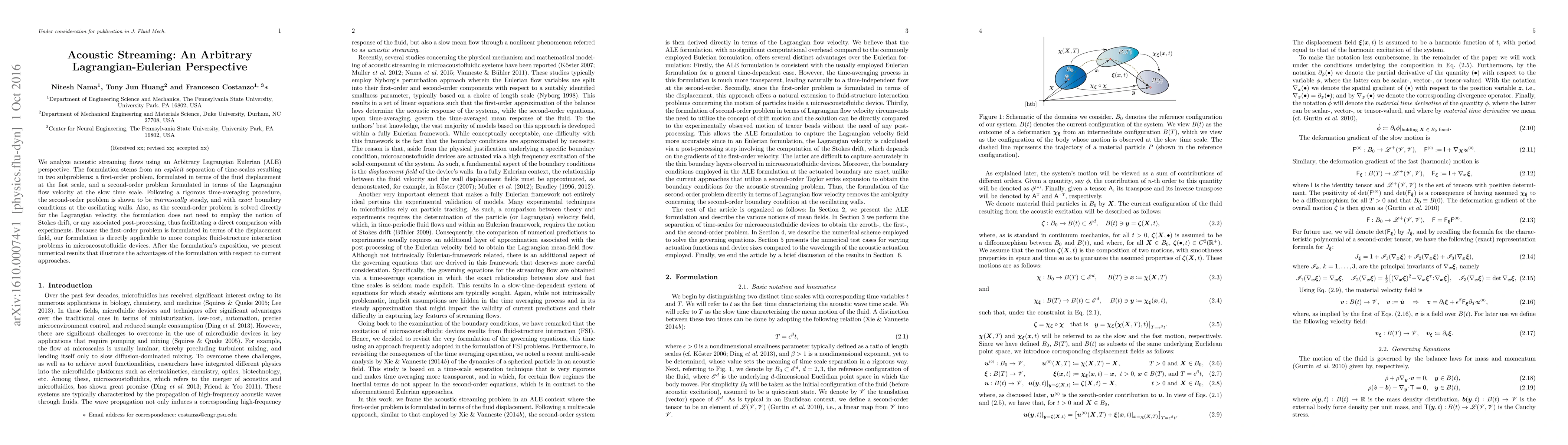 We analyze acoustic streaming flows using an ALE perspective. The formulation stems from an explicit separation of time-scales resulting in two subproblems: a first-order problem, formulated in terms of the fluid displacement at the fast scale, and a second-order problem formulated in terms of the Lagrangian flow velocity at the slow time scale. Following a rigorous time-averaging procedure, the second-order problem is shown to be intrinsically steady, and with exact boundary conditions at the oscillating walls. Also, as the second-order problem is solved directly for the Lagrangian velocity, the formulation does not need to employ the notion of Stokes drift, or any associated post-processing, thus facilitating a direct comparison with experiments. Because the first-order problem is formulated in terms of the displacement field, our formulation is directly applicable to more complex fluid-structure interaction problems in microacosutofluidic devices. After the formulation's exposition, we present numerical results that illustrate the advantages of the formulation with respect to current approaches.