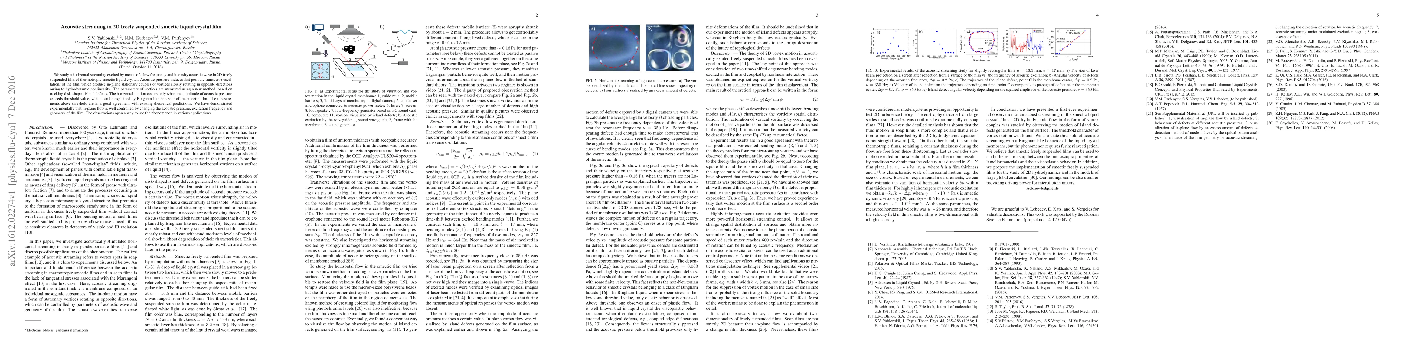 We study a horizontal streaming excited by means of a low frequency and intensity acoustic wave in 2D freely suspended film of thermotropic smectic liquid crystal. Acoustic pressure induces fast periodic transverse oscillations of the film, which produce in-plane stationary couples of vortices slowly rotating in opposite directions owing to hydrodynamic nonlinearity. The parameters of vortices are measured using a new method, based on tracking disk-shaped island defects. The horizontal motion occurs only when the amplitude of acoustic pressure exceeds threshold value, which can be explained by Bingham-like behavior of the smectic film. The measurements above threshold are in a good agreement with existing theoretical predictions. We have demonstrated experimentally that in-plane flow is well controlled by changing the acoustic pressure, excitation frequency and geometry of the film. The observations open a way to use the phenomenon in various applications.