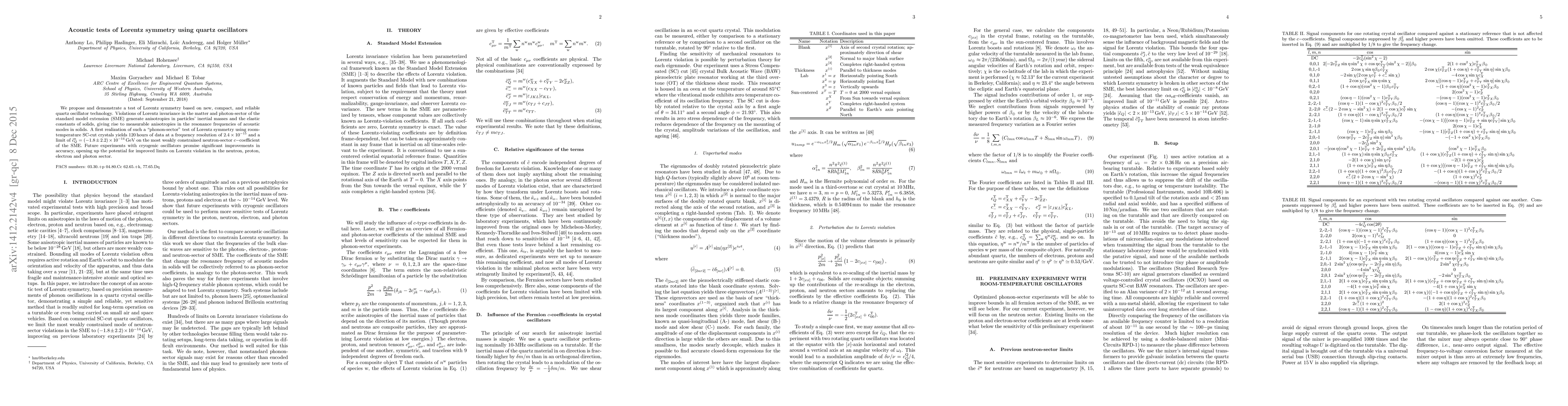 This paper tests Lorentz symmetry using quartz oscillators to detect anisotropies in resonance frequencies caused by potential violations in the standard model extension. Initial results show a limit on a neutron-sector coefficient, with future cryogenic experiments expected to improve accuracy and extend the limits on Lorentz violation across various sectors.