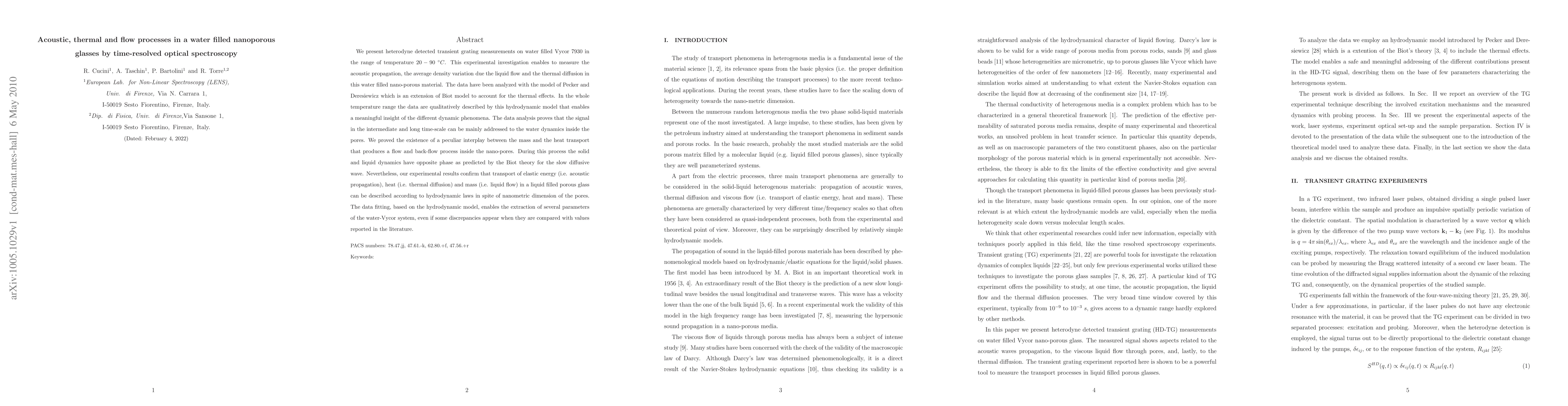 We present heterodyne detected transient grating measurements on water filled Vycor 7930 in the range of temperature 20 - 90 degrees C. This experimental investigation enables to measure the acoustic propagation, the average density variation due the liquid flow and the thermal diffusion in this water filled nano-porous material. The data have been analyzed with the model of Pecker and Deresiewicz which is an extension of Biot model to account for the thermal effects. In the whole temperature range the data are qualitatively described by this hydrodynamic model that enables a meaningful insight of the different dynamic phenomena. The data analysis proves that the signal in the intermediate and long time-scale can be mainly addressed to the water dynamics inside the pores. We proved the existence of a peculiar interplay between the mass and the heat transport that produces a flow and back-flow process inside the nano-pores. During this process the solid and liquid dynamics have opposite phase as predicted by the Biot theory for the slow diffusive wave. Nevertheless, our experimental results confirm that transport of elastic energy (i.e. acoustic propagation), heat (i.e. thermal diffusion) and mass (i.e. liquid flow) in a liquid filled porous glass can be described according to hydrodynamic laws in spite of nanometric dimension of the pores. The data fitting, based on the hydrodynamic model, enables the extraction of several parameters of the water-Vycor system, even if some discrepancies appear when they are compared with values reported in the literature.