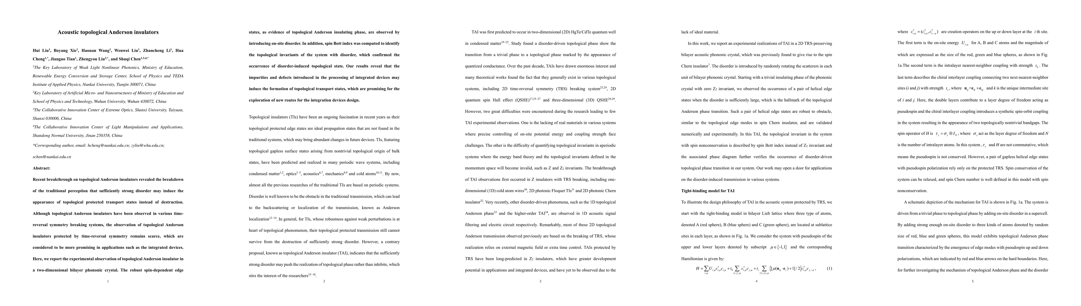 This paper reports the experimental observation of topological Anderson insulators in a two-dimensional bilayer phononic crystal, demonstrating that disorder can induce topologically protected transport states. The study confirms the presence of robust spin-dependent edge states and topological invariants, suggesting potential applications in integrated device design.