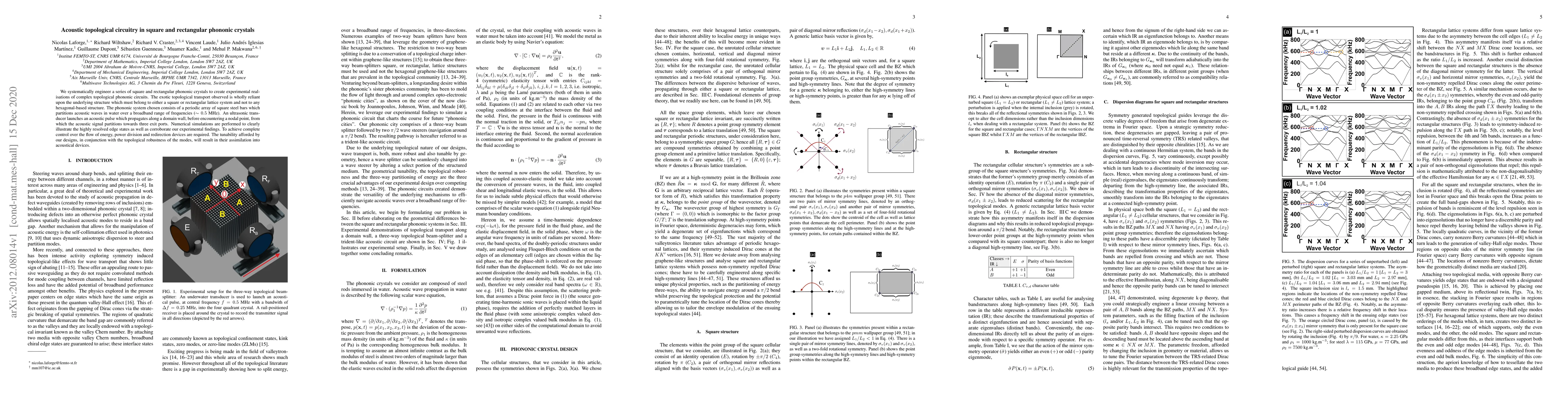 We systematically engineer a series of square and rectangular phononic crystals to create experimental realisations of complex topological phononic circuits. The exotic topological transport observed is wholly reliant upon the underlying structure which must belong to either a square or rectangular lattice system and not to any hexagonal-based structure. The phononic system chosen consists of a periodic array of square steel bars which partitions acoustic waves in water over a broadband range of frequencies (~0.5 MHz). An ultrasonic transducer launches an acoustic pulse which propagates along a domain wall, before encountering a nodal point, from which the acoustic signal partitions towards three exit ports. Numerical simulations are performed to clearly illustrate the highly resolved edge states as well as corroborate our experimental findings. To achieve complete control over the flow of energy, power division and redirection devices are required. The tunability afforded by our designs, in conjunction with the topological robustness of the modes, will result in their assimilation into acoustical devices.