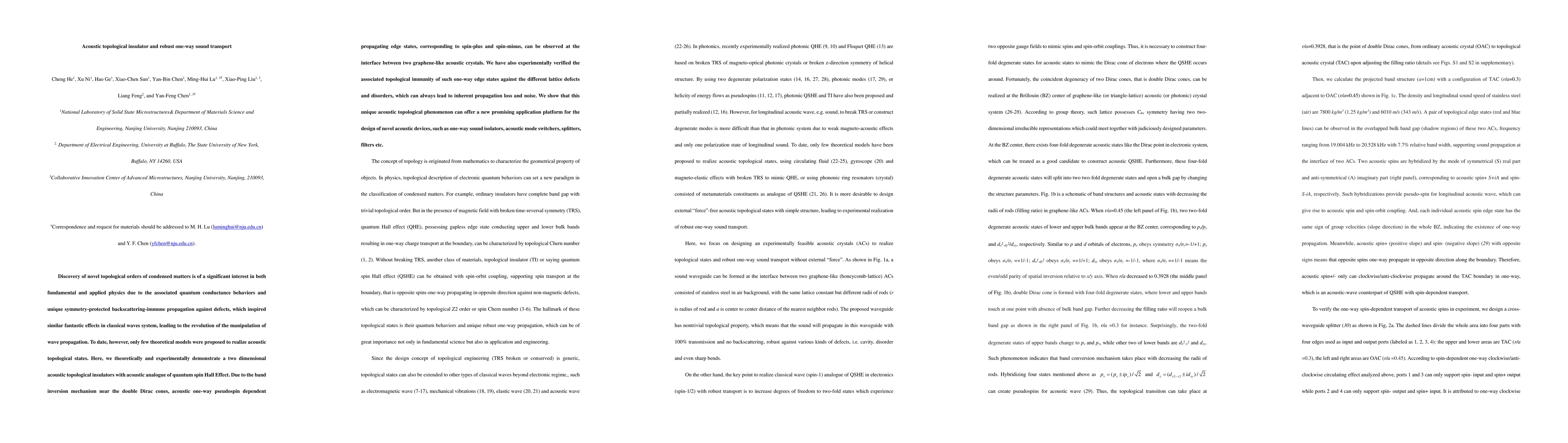 This paper demonstrates the theoretical and experimental realization of a two-dimensional acoustic topological insulator, showcasing the acoustic analogue of the quantum spin Hall Effect. The study reveals robust one-way sound transport along edge states, immune to lattice defects, suggesting potential applications in novel acoustic devices like one-way sound isolators and filters.