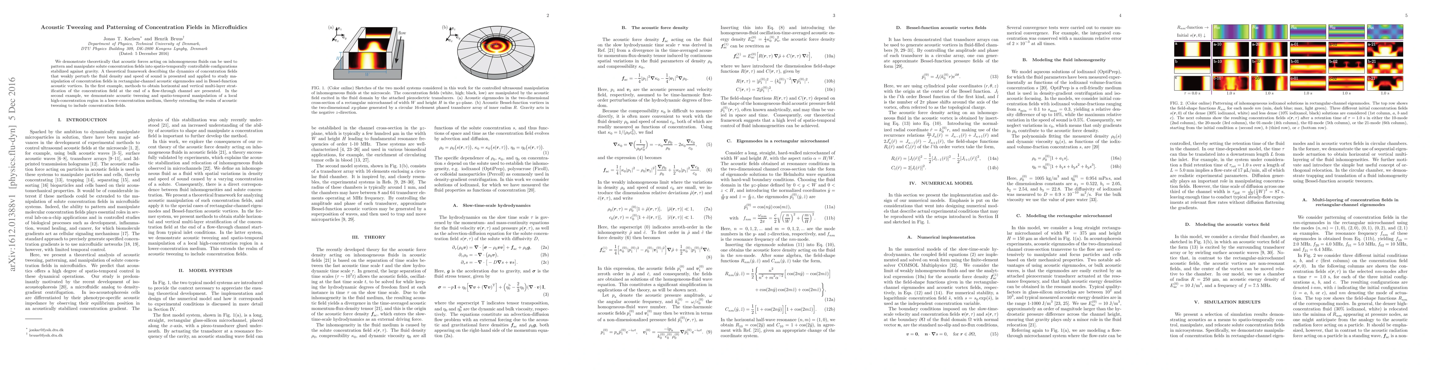 This paper presents a theoretical framework for using acoustic forces to manipulate solute concentration fields in microfluidics, demonstrating the ability to create controllable multi-layer stratification and to tweeze and pattern high-concentration regions within lower-concentration media. The study applies this framework to rectangular-channel acoustic eigenmodes and Bessel-function acoustic vortices.