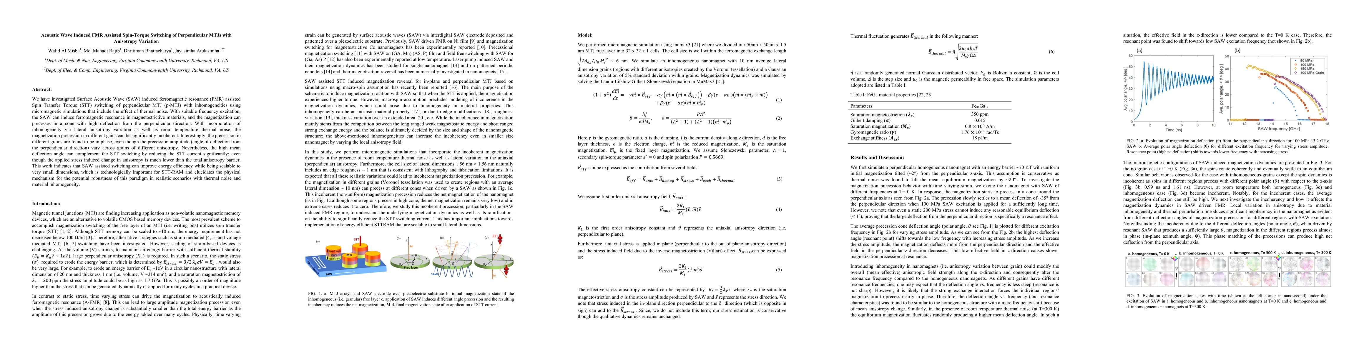 This paper investigates how Surface Acoustic Waves (SAW) can induce ferromagnetic resonance to assist Spin Transfer Torque switching in perpendicular Magnetic Tunnel Junctions (p-MTJs) with anisotropy variations, demonstrating improved energy efficiency through micromagnetic simulations. The study finds that despite material inhomogeneity and thermal noise, SAW-induced magnetization precession can significantly reduce required switching currents.