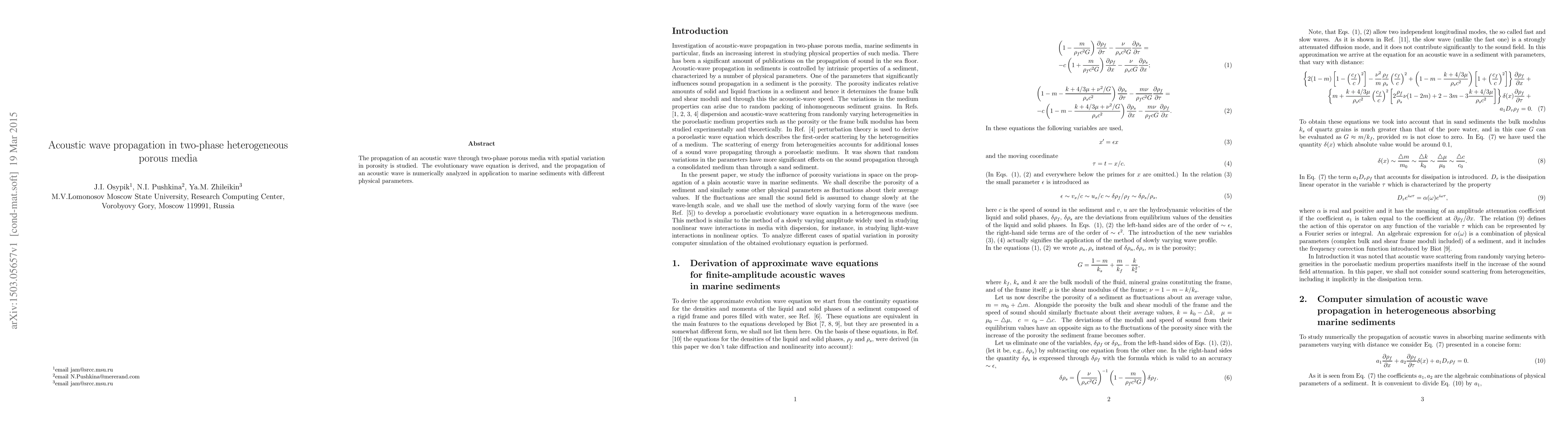 Summary: This research derives an evolutionary wave equation to study acoustic wave propagation in two-phase heterogeneous porous media, focusing on marine sediments with varying porosity, and employs numerical analysis to explore the effects of different physical parameters on wave behavior.