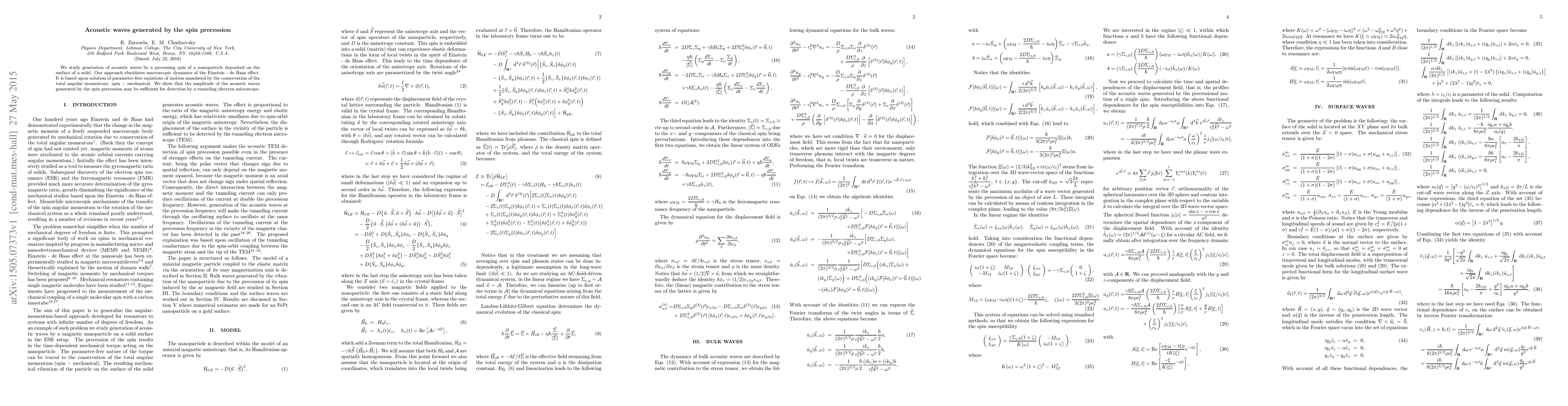 This study investigates the generation of acoustic waves by the spin precession in a nanoparticle on a solid surface, elucidating the macroscopic dynamics of the Einstein-de Haas effect through parameter-free equations of motion. The research demonstrates that the acoustic wave amplitude from spin precession may be detectable via a tunneling electron microscope.