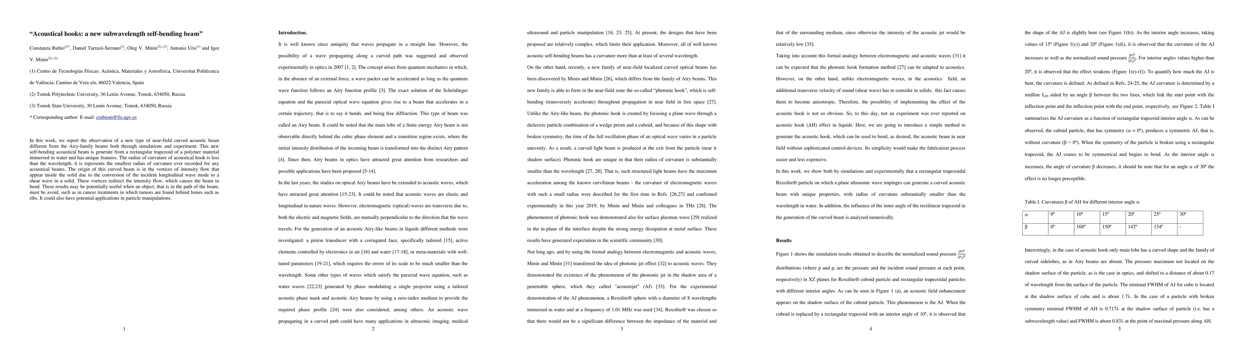 In this work, we report the observation of a new type of near-field curved acoustic beam different from the Airy-family beams both through simulations and experiment. This new self-bending acoustical beam is generate from a rectangular trapezoid of a polymer material immersed in water and has unique features. The radius of curvature of acoustical hook is less than the wavelength, it is represents the smallest radius of curvature ever recorded for any acoustical beams. The origin of this curved beam is in the vortices of intensity flow that appear inside the solid due to the conversion of the incident longitudinal wave mode to a shear wave in a solid. These vortices redirect the intensity flow, which causes the beam to bend. These results may be potentially useful when an object, that is in the path of the beam, must be avoid, such as in cancer treatments in which tumors are found behind bones such as ribs. It could also have potential applications in particle manipulations.