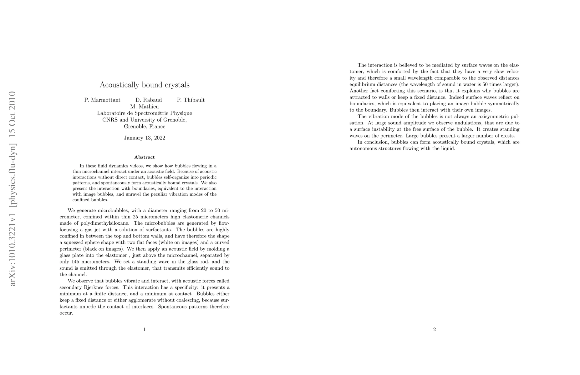 In these fluid dynamics videos, we show how bubbles flowing in a thin microchannel interact under an acoustic field. Because of acoustic interactions without direct contact, bubbles self-organize into periodic patterns, and spontaneously form acoustically bound crystals. We also present the interaction with boundaries, equivalent to the interaction with image bubbles, and unravel the peculiar vibration modes of the confined bubbles.