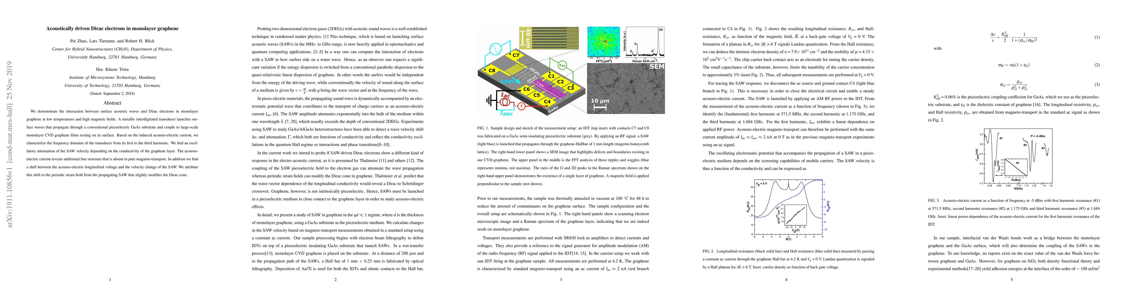This paper investigates the interaction between surface acoustic waves (SAWs) and Dirac electrons in monolayer graphene, revealing oscillatory attenuation of SAW velocity tied to graphene's conductivity and identifying a shift in acousto-electric voltage due to periodic strain fields modifying the Dirac cone.