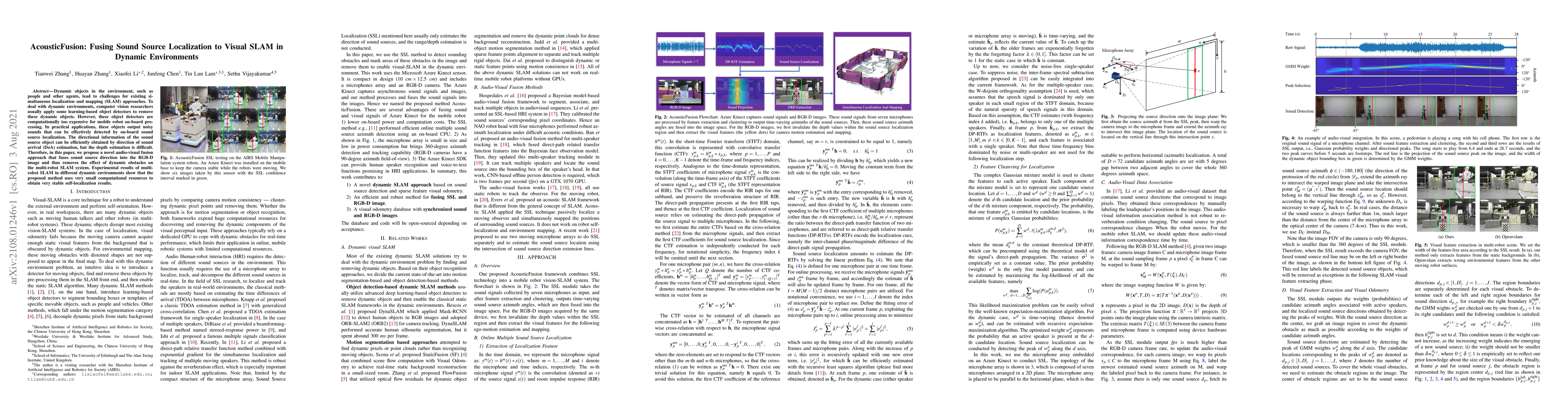 Title: AcousticFusion: Fusing Sound Source Localization to Visual SLAM in Dynamic Environments Summary: This paper proposes an audio-visual fusion method to enhance multi-robot SLAM by incorporating sound source localization, reducing computational costs, and improving stability in dynamic environments by mitigating the effects of moving obstacles.