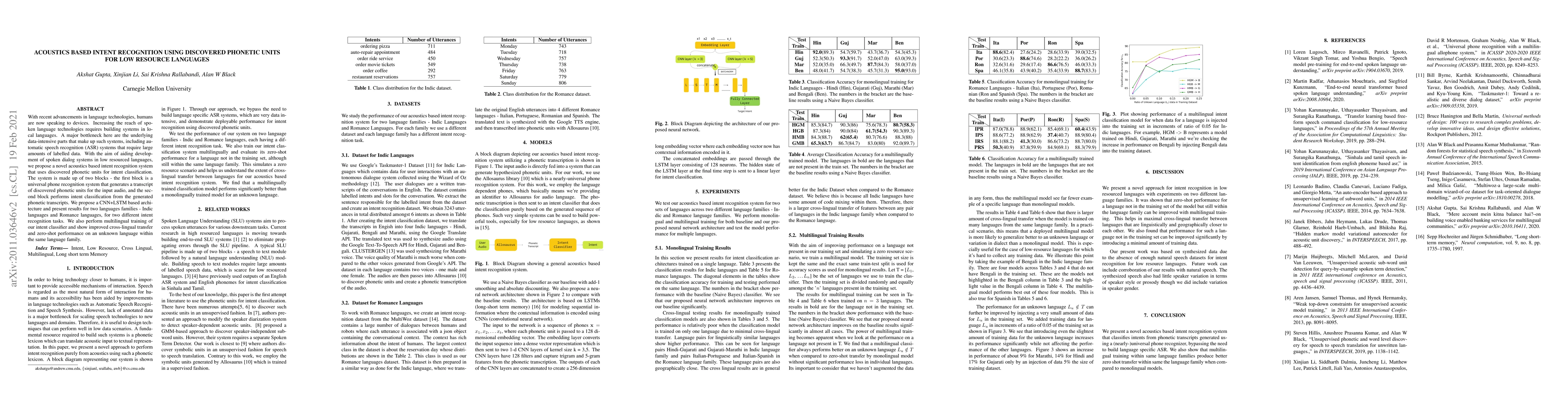 This paper proposes an acoustics-based intent recognition system for low resource languages using discovered phonetic units, employing a CNN+LSTM architecture for intent classification from phonetic transcripts. It demonstrates multilingual training benefits and improved cross-lingual transfer performance for Indic and Romance languages.
