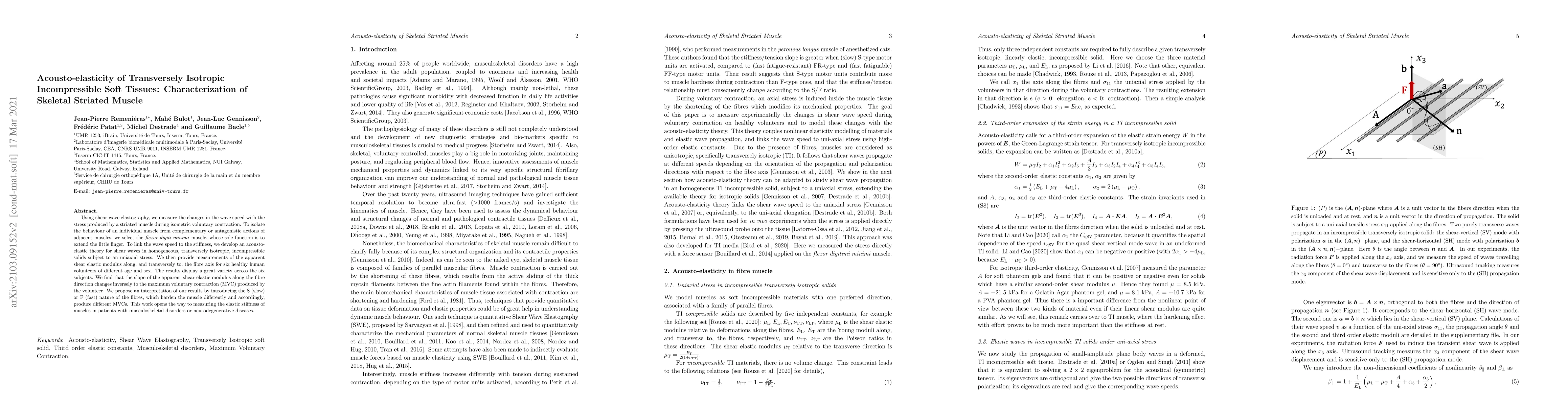 Using shear wave elastography, we measure the changes in the wave speed with the stress produced by a striated muscle during isometric voluntary contraction. To isolate the behaviour of an individual muscle from complementary or antagonistic actions of adjacent muscles, we select the flexor digiti minimi muscle, whose sole function is to extend the little finger. To link the wave speed to the stiffness, we develop an acousto-elastic theory for shear waves in homogeneous, transversely isotropic, incompressible solids subject to uniaxial stress. We then provide measurements of the apparent shear elastic modulus along, and transversely to, the fibre axis for six healthy human volunteers of different age and sex. The results display a great variety across the six subjects. We find that the slope of the apparent shear elastic modulus along the fibre direction changes inversely to the maximum voluntary contraction (MVC) produced by the volunteer. We propose an interpretation of our results by introducing the S (slow) or F (fast) nature of the fibres, which harden the muscle differently and accordingly, produce different MVCs. This work opens the way to measuring the elastic stiffness of muscles in patients with musculoskeletal disorders or neurodegenerative diseases.