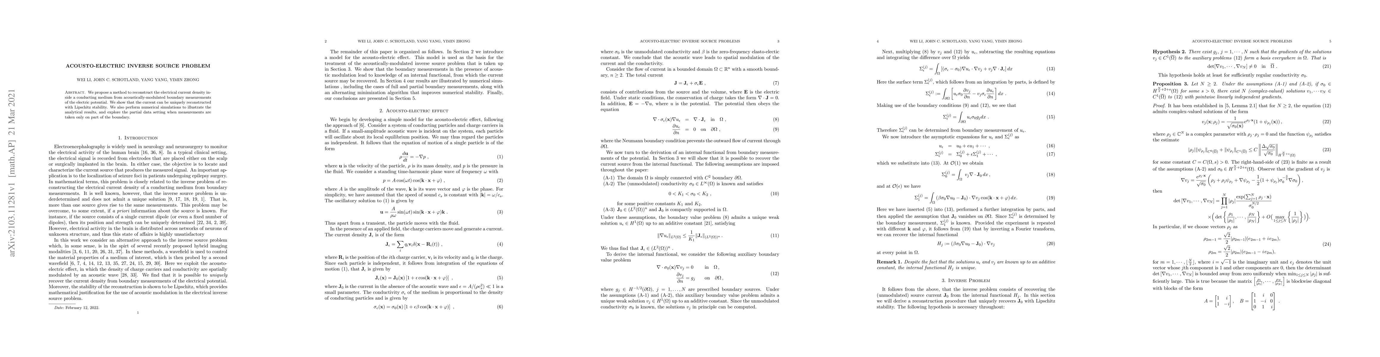 Researchers propose a method to reconstruct electrical current density inside a conducting medium from acoustically-modulated boundary measurements of electric potential with unique Lipschitz stability.