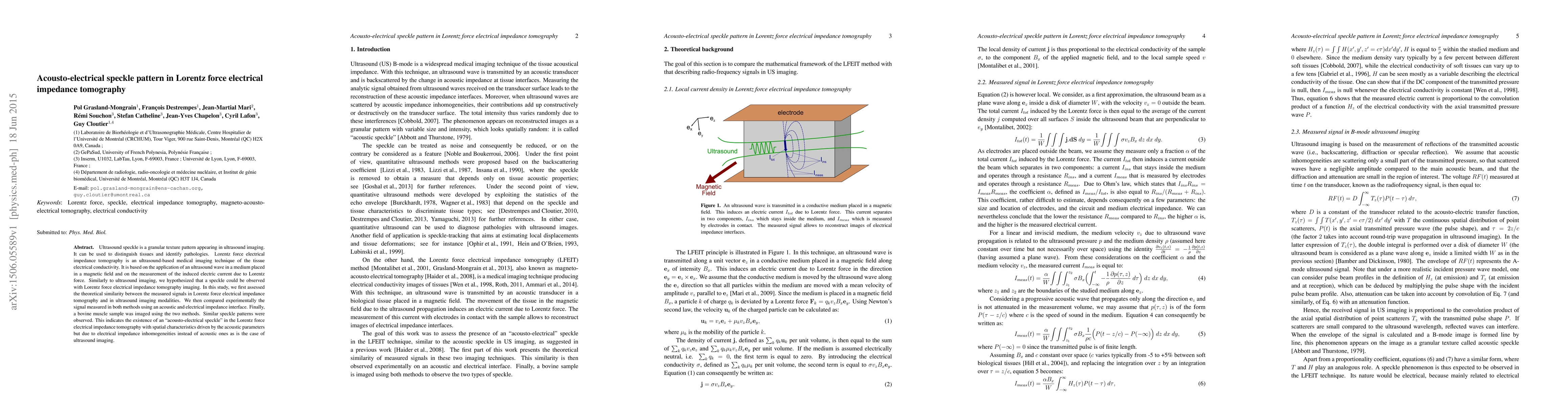 Ultrasound speckle is a granular texture pattern appearing in ultrasound imaging. It can be used to distinguish tissues and identify pathologies. Lorentz force electrical impedance tomography is an ultrasound-based medical imaging technique of the tissue electrical conductivity. It is based on the application of an ultrasound wave in a medium placed in a magnetic field and on the measurement of the induced electric current due to Lorentz force. Similarly to ultrasound imaging, we hypothesized that a speckle could be observed with Lorentz force electrical impedance tomography imaging. In this study, we first assessed the theoretical similarity between the measured signals in Lorentz force electrical impedance tomography and in ultrasound imaging modalities. We then compared experimentally the signal measured in both methods using an acoustic and electrical impedance interface. Finally, a bovine muscle sample was imaged using the two methods. Similar speckle patterns were observed. This indicates the existence of an "acousto-electrical speckle" in the Lorentz force electrical impedance tomography with spatial characteristics driven by the acoustic parameters but due to electrical impedance inhomogeneities instead of acoustic ones as is the case of ultrasound imaging.