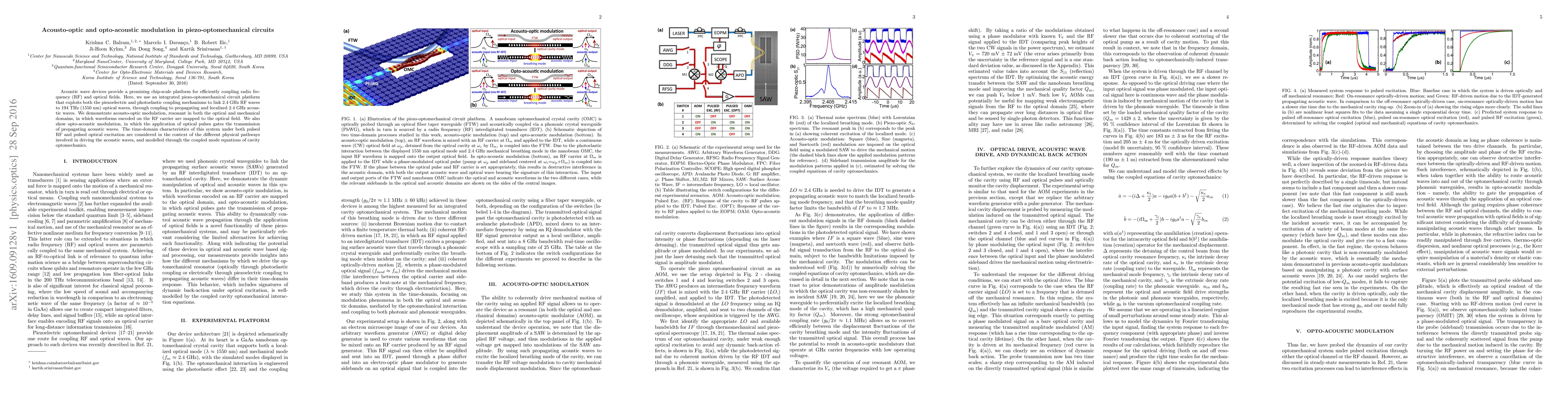 Acoustic wave devices provide a promising chip-scale platform for efficiently coupling radio frequency (RF) and optical fields. Here, we use an integrated piezo-optomechanical circuit platform that exploits both the piezoelectric and photoelastic coupling mechanisms to link 2.4 GHz RF waves to 194 THz (1550 nm) optical waves, through coupling to propagating and localized 2.4 GHz acoustic waves. We demonstrate acousto-optic modulation, resonant in both the optical and mechanical domains, in which waveforms encoded on the RF carrier are mapped to the optical field. We also show opto-acoustic modulation, in which the application of optical pulses gates the transmission of propagating acoustic waves. The time-domain characteristics of this system under both pulsed RF and pulsed optical excitation are considered in the context of the different physical pathways involved in driving the acoustic waves, and modeled through the coupled mode equations of cavity optomechanics.