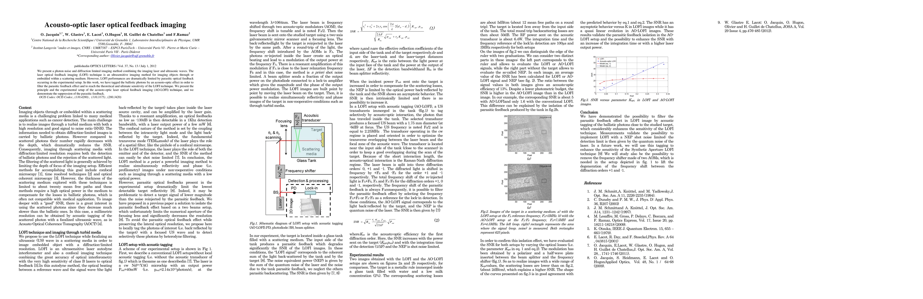We present a photon noise and diffraction limited imaging method combining the imaging laser and ultrasonic waves. The laser optical feedback imaging (LOFI) technique is an ultrasensitive imaging method for imaging objects through or embedded within a scattering medium. However, LOFI performances are dramatically limited by parasitic optical feedback occurring in the experimental setup. In this work, we have tagged the ballistic photons by an acousto-optic effect in order to filter the parasitic feedback effect and to reach the theoretical and ultimate sensitivity of the LOFI technique. We present the principle and the experimental setup of the acousto-optic laser optical feedback imaging (AO-LOFI) technique, and we demonstrate the suppression of the parasitic feedback.