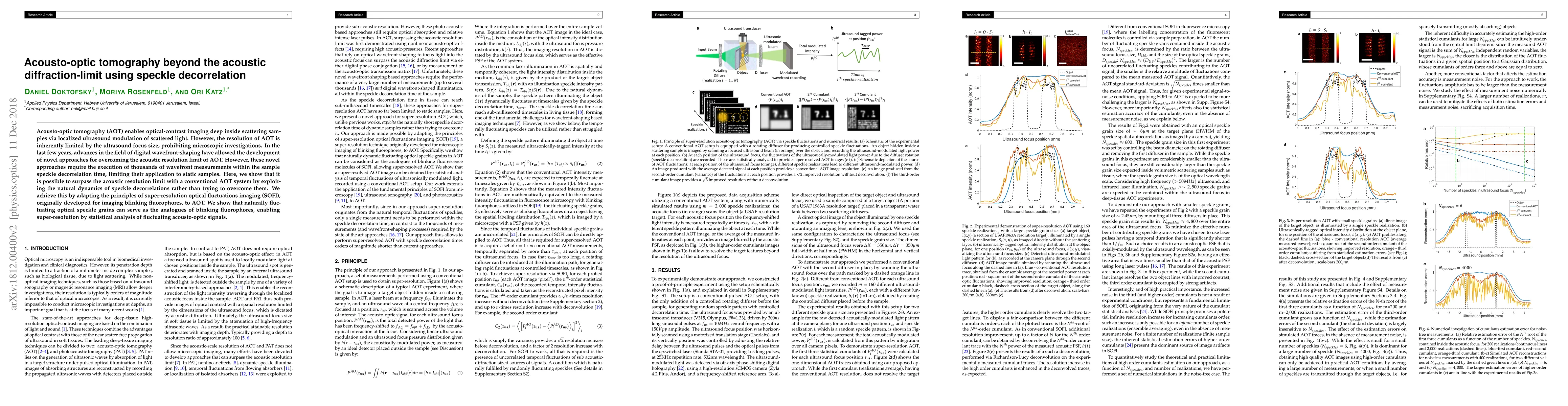 This paper demonstrates that acousto-optic tomography (AOT) can achieve super-resolution imaging beyond the acoustic diffraction limit by leveraging the natural dynamics of speckle decorrelation, rather than attempting to overcome it. By adapting super-resolution optical fluctuations imaging (SOFI) principles, the authors show that fluctuating optical speckle grains can enable enhanced resolution through statistical analysis of acousto-optic signals.