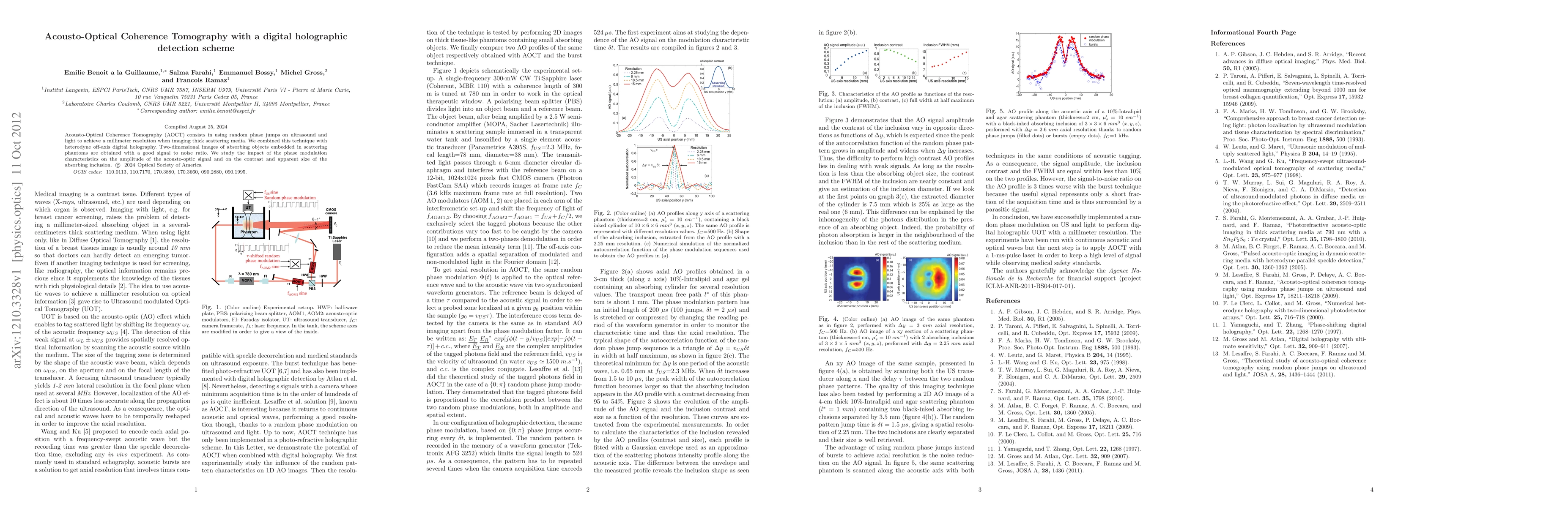Acousto-optical coherence tomography (AOCT) consists in using random phase jumps on ultrasound and light to achieve a millimeter resolution when imaging thick scattering media. We combined this technique with heterodyne off-axis digital holography. Two-dimensional images of absorbing objects embedded in scattering phantoms are obtained with a good signal-to-noise ratio. We study the impact of the phase modulation characteristics on the amplitude of the acousto-optic signal and on the contrast and apparent size of the absorbing inclusion.