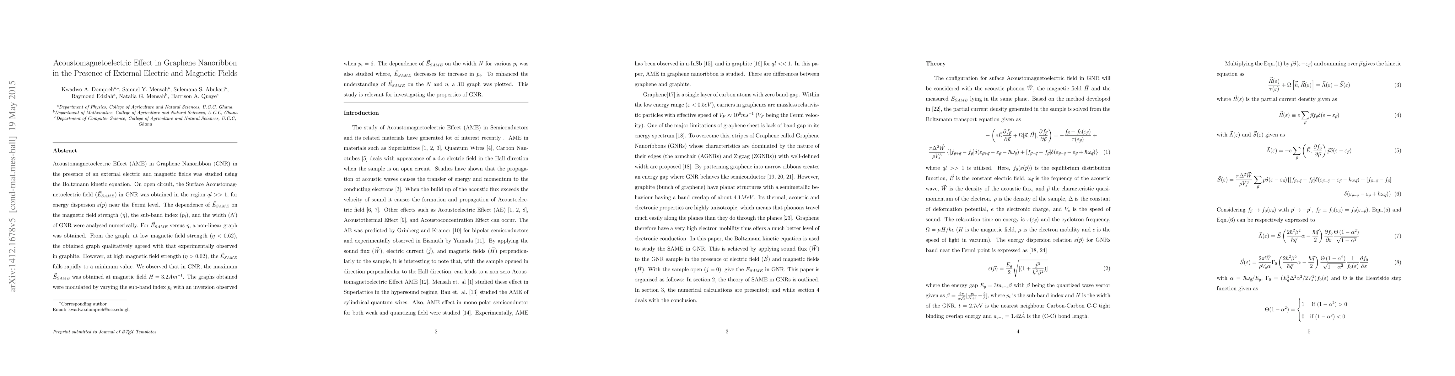 The Acoustomagnetoelectric Effect (AME) in Graphene Nanoribbon (GNR) was theoretically studied using the Boltzmann kinetic equation. On open circuit, the general formular for Surface Acoustomagnetoelectric field ($\vec{E}_{SAME}$) in GNR with energy dispersion $\varepsilon(p)$ near the Fermi point was calculated. The $E_{SAME}$ was found to depend on the magnetic strength ($\eta$), $\alpha$ = ${\hbar \omega_q}/{E_g}$ and the energy gap ($E_g$). The expression for $\vec{E}_{SAME}$ was analyzed numerically for varying width of GNR, magnetic strength ($\eta$) and $\alpha$ at different sub-bands indices ($p_i$). It was noted that the dependence of $\vec{E}_{SAME}$ on the width of GNR increased to a saturation point of approximately $15$Vcm$^{-1}$ and remained constant. For $E_{SAME}$ versus $\eta$, the $E_{SAME}$ increases rapidly to a maximum point and then decayed to a constant minimum value. The graph was modulated either by varying the width of GNR or the sub-band index $p_i$ with an inversion occurring at $p_i = 6$. The dependence of $E_{SAME}$ versus $\alpha$ was analyzed. The $E_{SAME}$ was constant up to a point and sharply increased asymptotically at approximately $\alpha = 1$. A $3$D graph of $\vec{E}_{SAME}$ with $\eta$ and width is also presented. This study is relevant for investigating the properties of GNR.