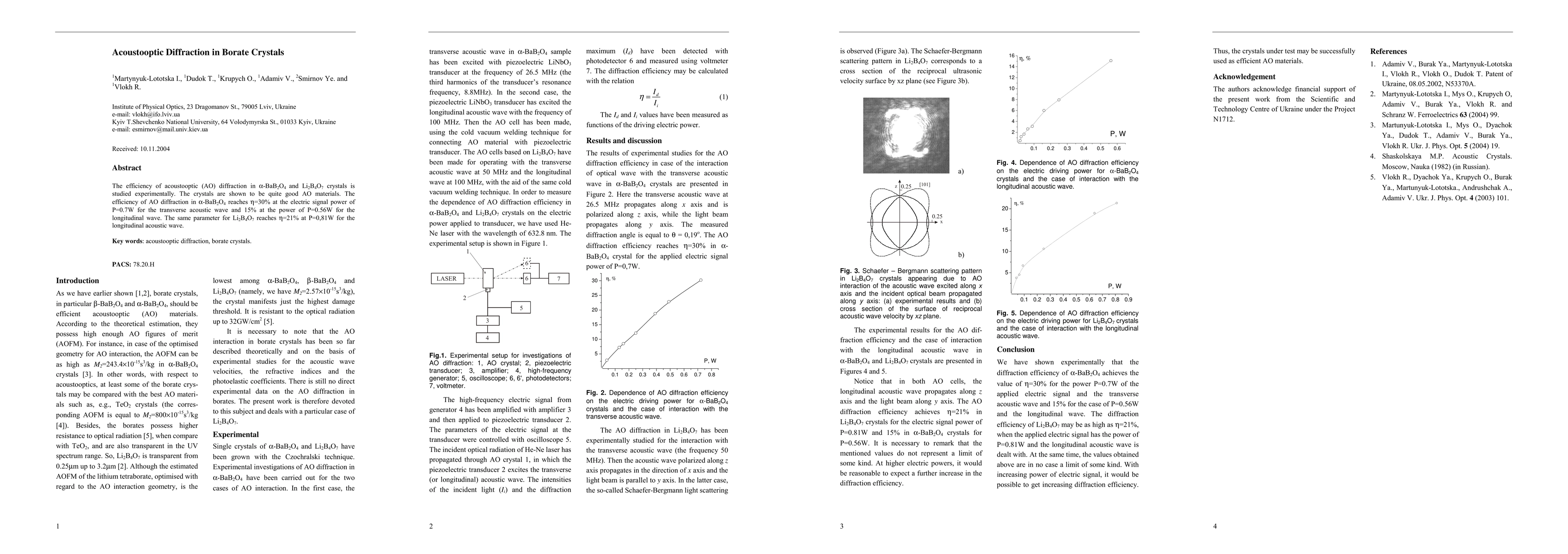 This study experimentally investigates acoustooptic diffraction efficiency in a-BaB2O4 and Li2B4O7 crystals, finding high efficiency with a-BaB2O4 achieving 30% at 0.7W for transverse waves and 15% at 0.56W for longitudinal waves, while Li2B4O7 reaches 21% efficiency at 0.81W for longitudinal waves.