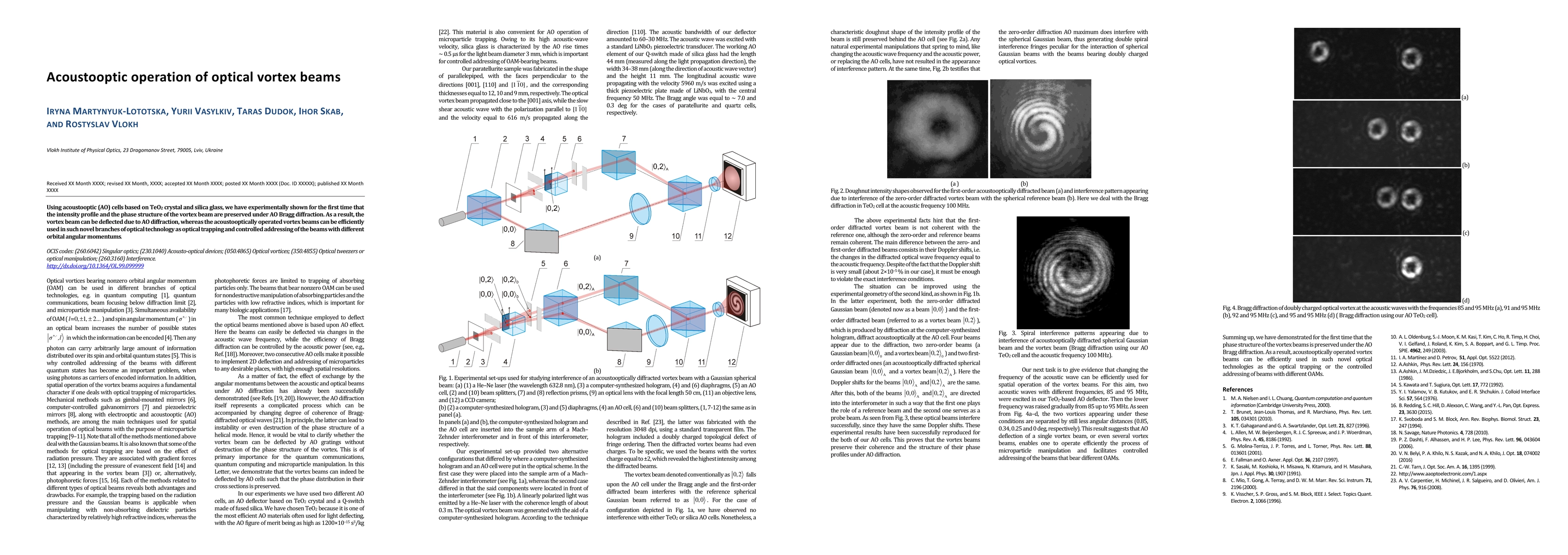 This paper demonstrates the preservation of intensity and phase structure of optical vortex beams under acoustooptic Bragg diffraction using TeO2 crystal and silica glass AO cells. The findings suggest potential applications in optical trapping and beam addressing with different orbital angular momentums.
