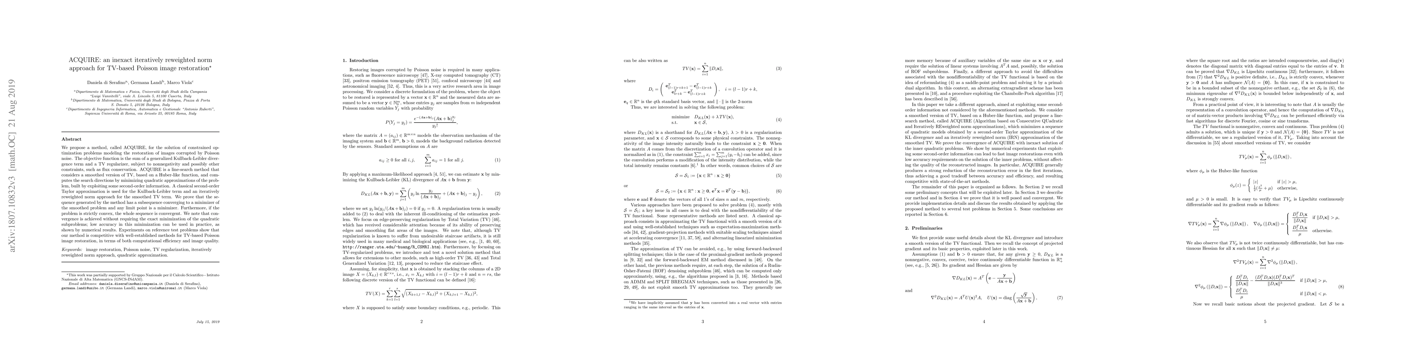 The paper introduces ACQUIRE, a method for image restoration from Poisson noise, combining a generalized Kullback-Leibler divergence term with a smoothed total variation (TV) regularizer. ACQUIRE is an inexact iteratively reweighted norm approach, using a line-search with low-accuracy quadratic subproblem minimization. The method guarantees convergence to a minimizer of the smoothed problem, with full convergence for strictly convex problems. Numerical experiments demonstrate ACQUIRE's competitiveness with established TV-based Poisson image restoration methods in terms of efficiency and image quality.