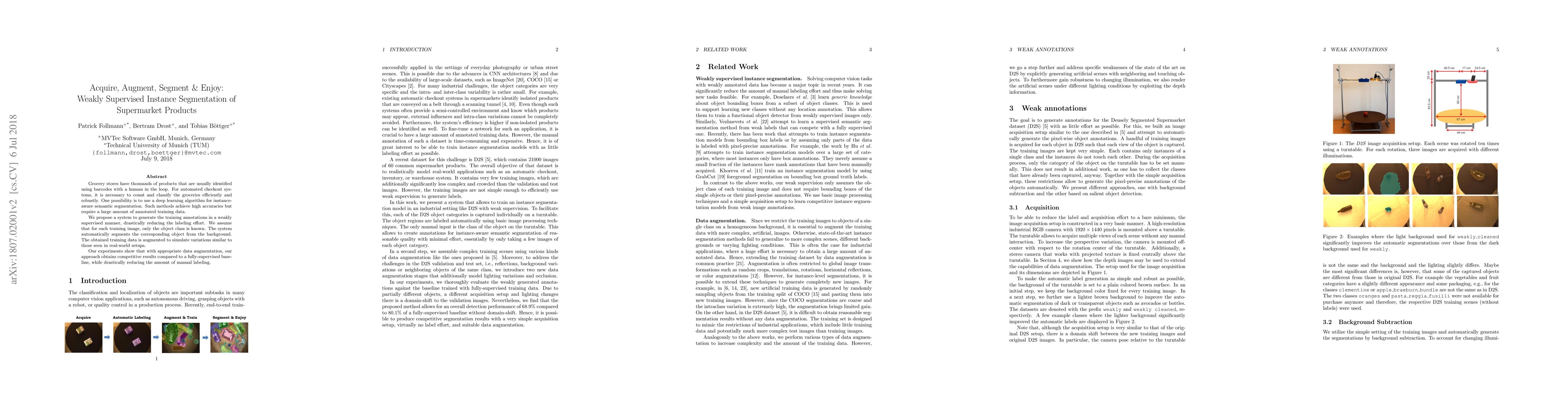 Grocery stores have thousands of products that are usually identified using barcodes with a human in the loop. For automated checkout systems, it is necessary to count and classify the groceries efficiently and robustly. One possibility is to use a deep learning algorithm for instance-aware semantic segmentation. Such methods achieve high accuracies but require a large amount of annotated training data. We propose a system to generate the training annotations in a weakly supervised manner, drastically reducing the labeling effort. We assume that for each training image, only the object class is known. The system automatically segments the corresponding object from the background. The obtained training data is augmented to simulate variations similar to those seen in real-world setups.