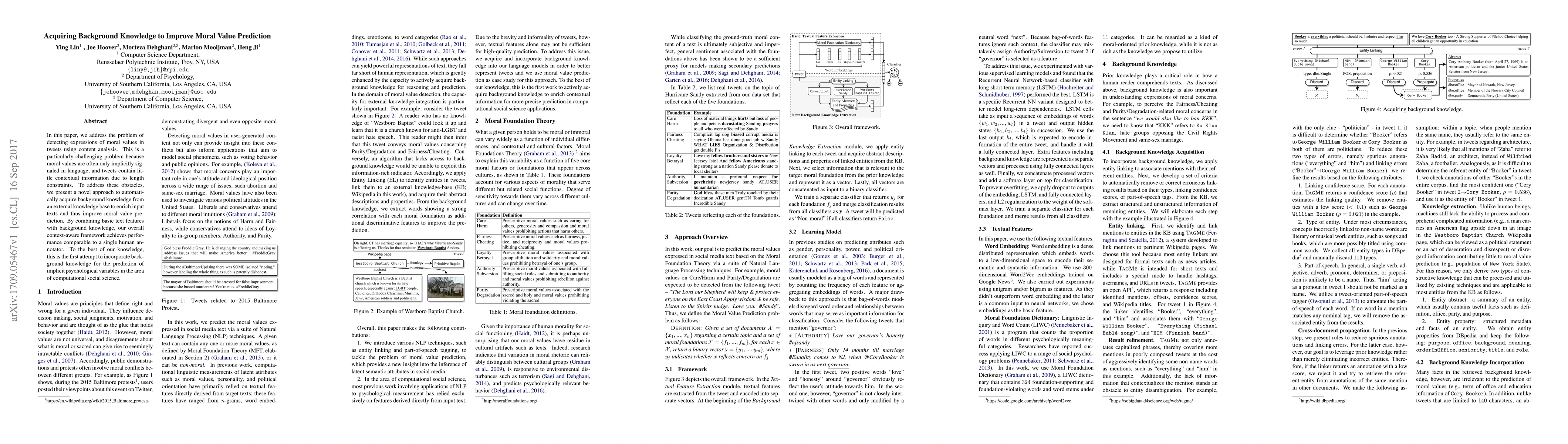 The paper presents a context-aware framework for detecting expressions of moral values in tweets by combining basic text features with background knowledge acquired from an external knowledge base.