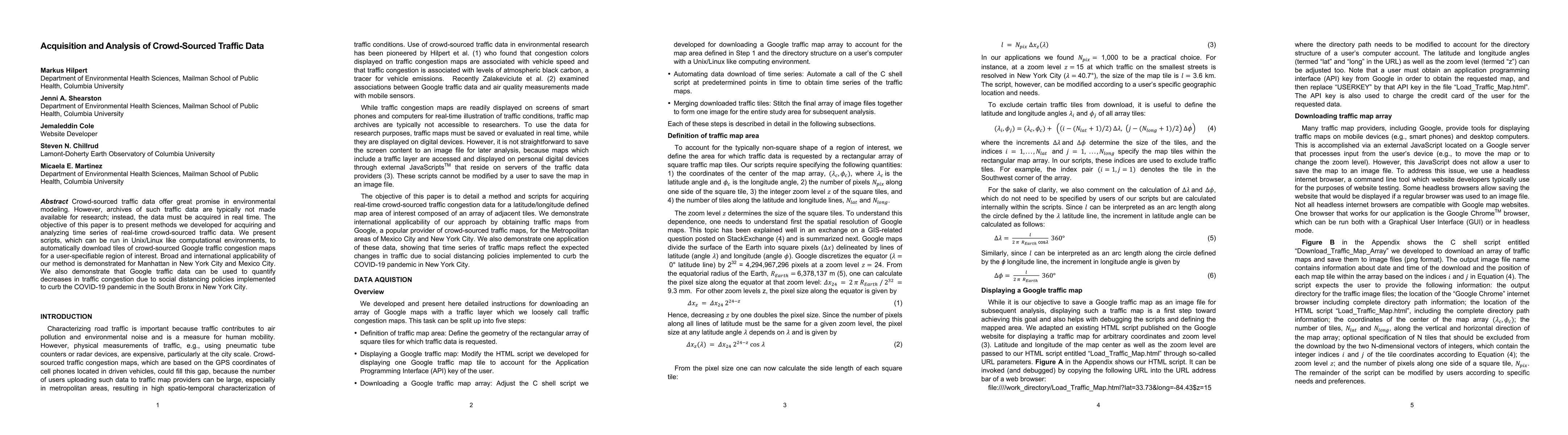 Crowd-sourced traffic data offer great promise in environmental modeling. However, archives of such traffic data are typically not made available for research; instead, the data must be acquired in real time. The objective of this paper is to present methods we developed for acquiring and analyzing time series of real-time crowd-sourced traffic data. We present scripts, which can be run in Unix/Linux like computational environments, to automatically download tiles of crowd-sourced Google traffic congestion maps for a user-specifiable region of interest. Broad and international applicability of our method is demonstrated for Manhattan in New York City and Mexico City. We also demonstrate that Google traffic data can be used to quantify decreases in traffic congestion due to social distancing policies implemented to curb the COVID-19 pandemic in the South Bronx in New York City.
