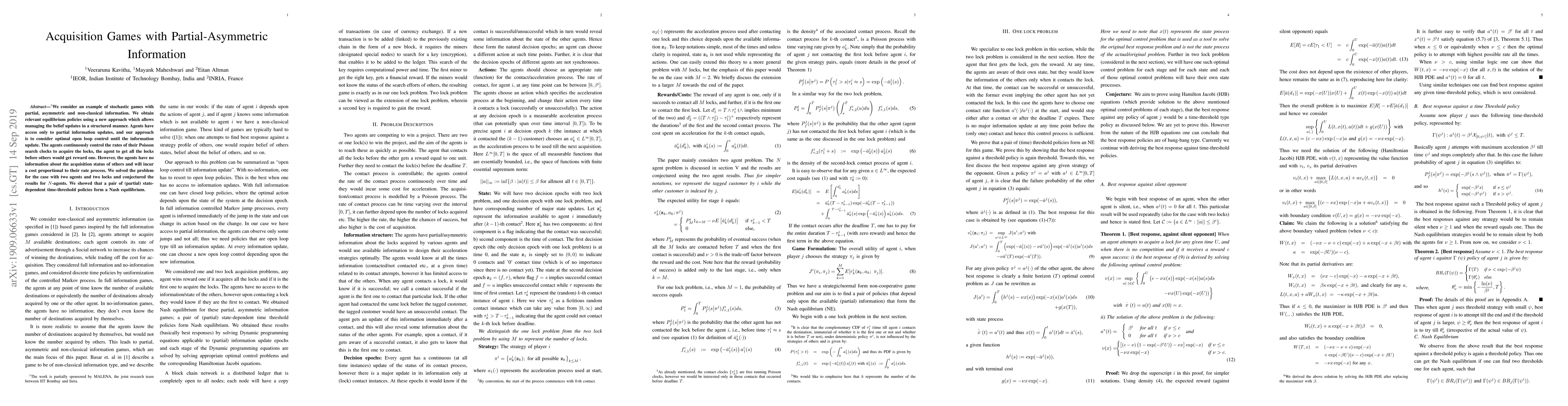 This paper studies stochastic games with partial and asymmetric information, focusing on acquisition games where agents compete to acquire locks. A novel method is developed to manage belief updates, employing optimal open-loop control. The model is solved for two agents and two locks, demonstrating that state-dependent time-threshold policies form a Nash equilibrium.