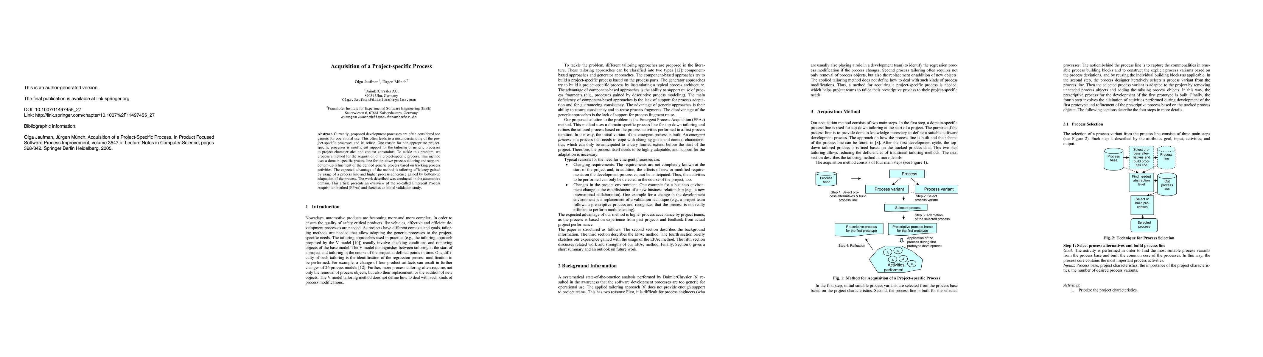 Currently, proposed development processes are often considered too generic for operational use. This often leads to a misunderstanding of the project-specific processes and its refuse. One reason for non-appropriate project-specific processes is insufficient support for the tailoring of generic processes to project characteristics and context constraints. To tackle this problem, we propose a method for the acquisition of a project-specific process. This method uses a domain-specific process line for top-down process tailoring and supports bottom-up refinement of the defined generic process based on tracking process activities. The expected advantage of the method is tailoring efficiency gained by usage of a process line and higher process adherence gained by bottom-up adaptation of the process. The work described was conducted in the automotive domain. This article presents an overview of the so-called Emergent Process Acquisition method (EPAc) and sketches an initial validation study.