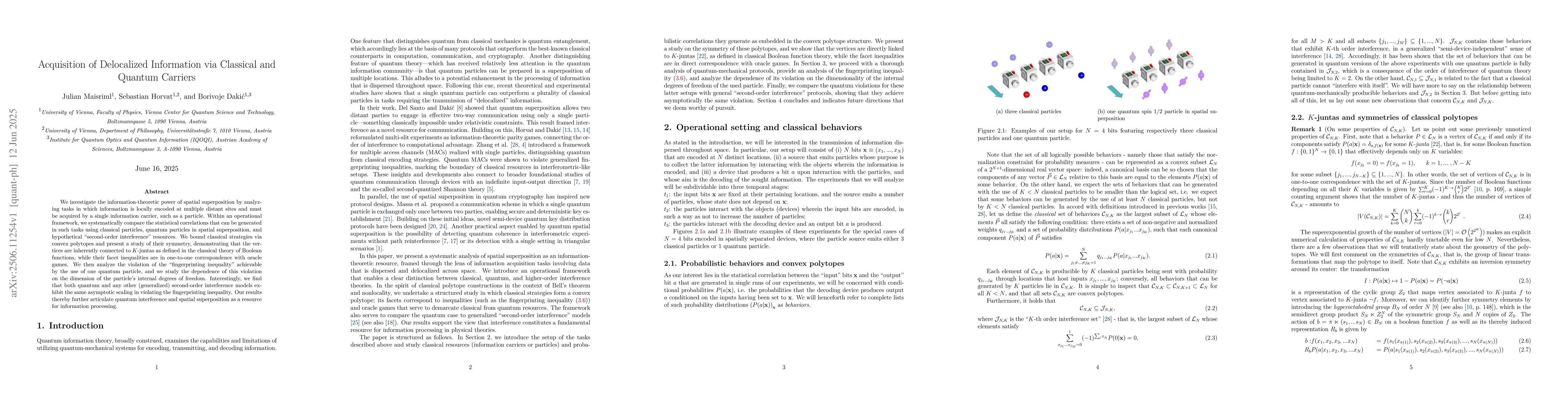 We investigate the information-theoretic power of spatial superposition by analyzing tasks in which information is locally encoded at multiple distant sites and must be acquired by a single information carrier, such as a particle. Within an operational framework, we systematically compare the statistical correlations that can be generated in such tasks using classical particles, quantum particles in spatial superposition, and hypothetical "second-order interference" resources. We bound classical strategies via convex polytopes and present a study of their symmetry, demonstrating that the vertices are inherently connected to K-juntas as defined in the classical theory of Boolean functions, while their facet inequalities are in one-to-one correspondence with oracle games. We then analyze the violation of the "fingerprinting inequality" achievable by the use of one quantum particle, and we study the dependence of this violation on the dimension of the particle's internal degrees of freedom. Interestingly, we find that both quantum and any other (generalized) second-order interference models exhibit the same asymptotic scaling in violating the fingerprinting inequality. Our results thereby further articulate quantum interference and spatial superposition as a resource for information processing.