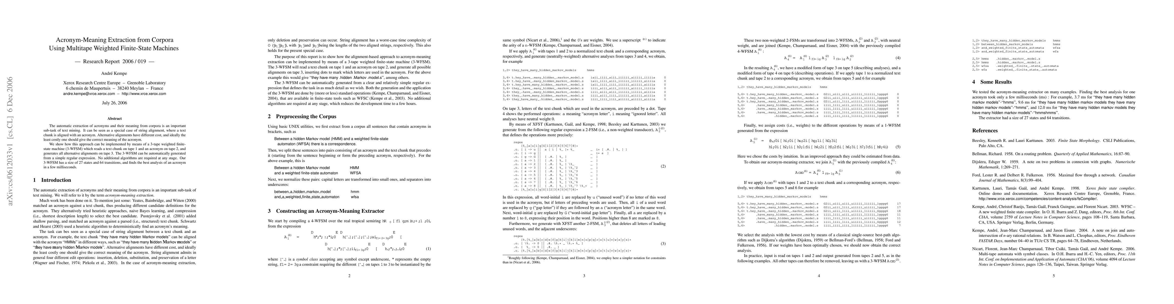 The research uses a 3-tape weighted finite-state machine (3-WFSM) to extract acronyms and their meaning from corpora.