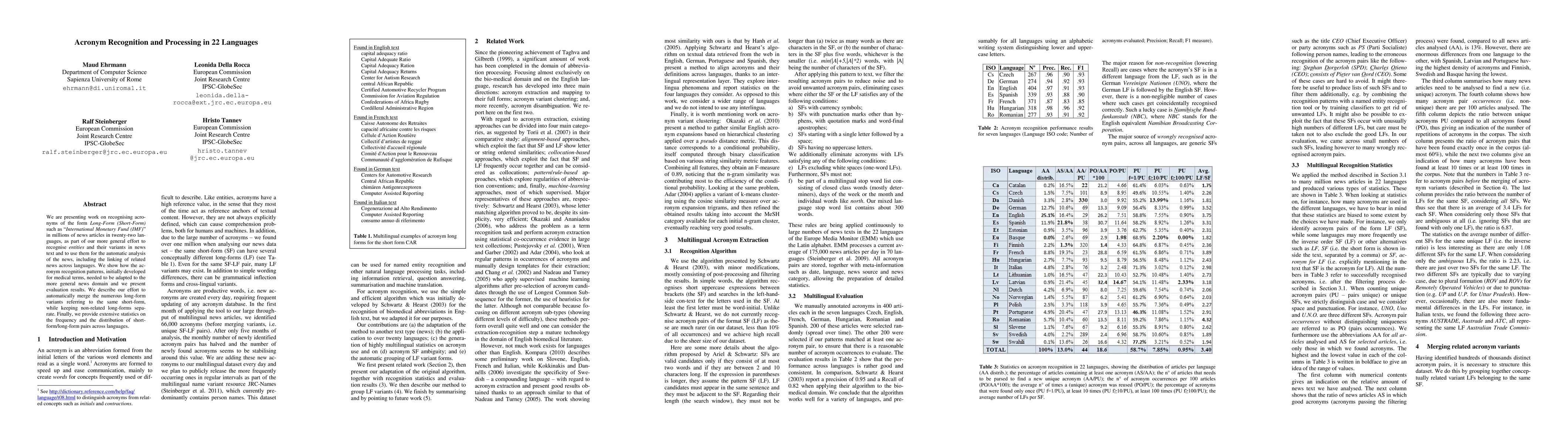 We are presenting work on recognising acronyms of the form Long-Form (Short-Form) such as "International Monetary Fund (IMF)" in millions of news articles in twenty-two languages, as part of our more general effort to recognise entities and their variants in news text and to use them for the automatic analysis of the news, including the linking of related news across languages. We show how the acronym recognition patterns, initially developed for medical terms, needed to be adapted to the more general news domain and we present evaluation results. We describe our effort to automatically merge the numerous long-form variants referring to the same short-form, while keeping non-related long-forms separate. Finally, we provide extensive statistics on the frequency and the distribution of short-form/long-form pairs across languages.