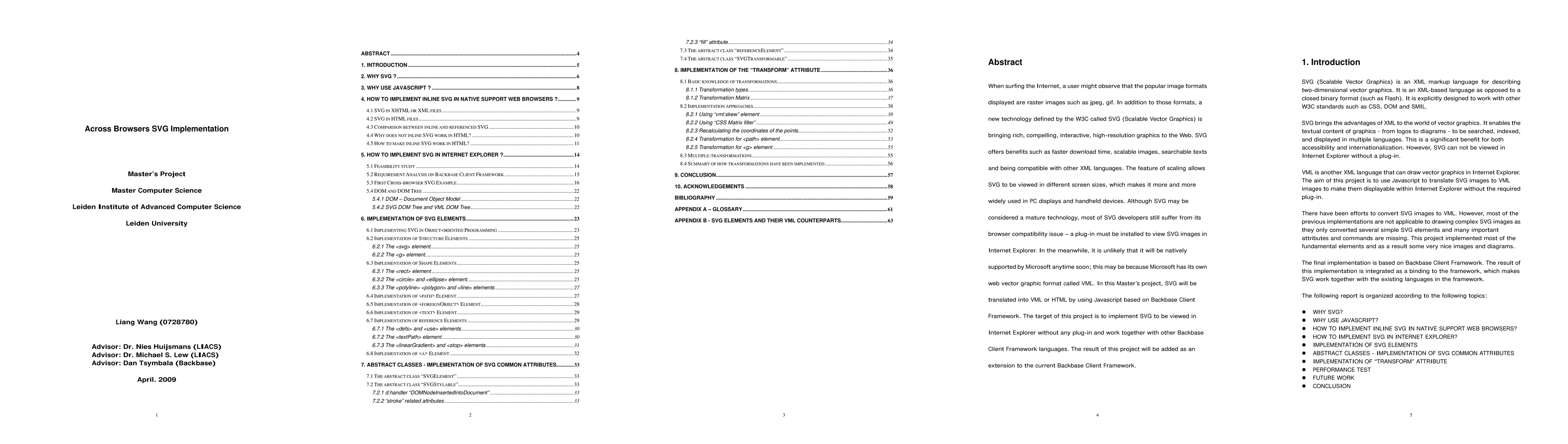 In this work SVG will be translated into VML or HTML by using Javascript based on Backbase Client Framework. The target of this project is to implement SVG to be viewed in Internet Explorer without any plug-in and work together with other Backbase Client Framework languages. The result of this project will be added as an extension to the current Backbase Client Framework.