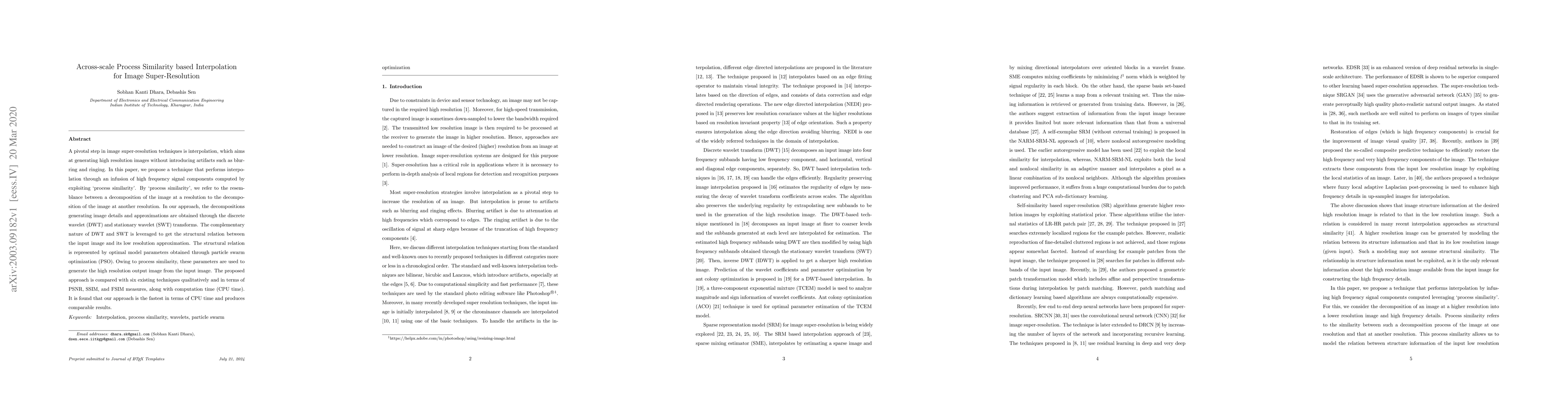 This paper proposes a novel interpolation technique for image super-resolution that leverages process similarity across scales using discrete and stationary wavelet transforms, optimized by particle swarm optimization, to generate high-resolution images with minimal artifacts. The method is faster than existing techniques and produces comparable results in terms of PSNR, SSIM, and FSIM.