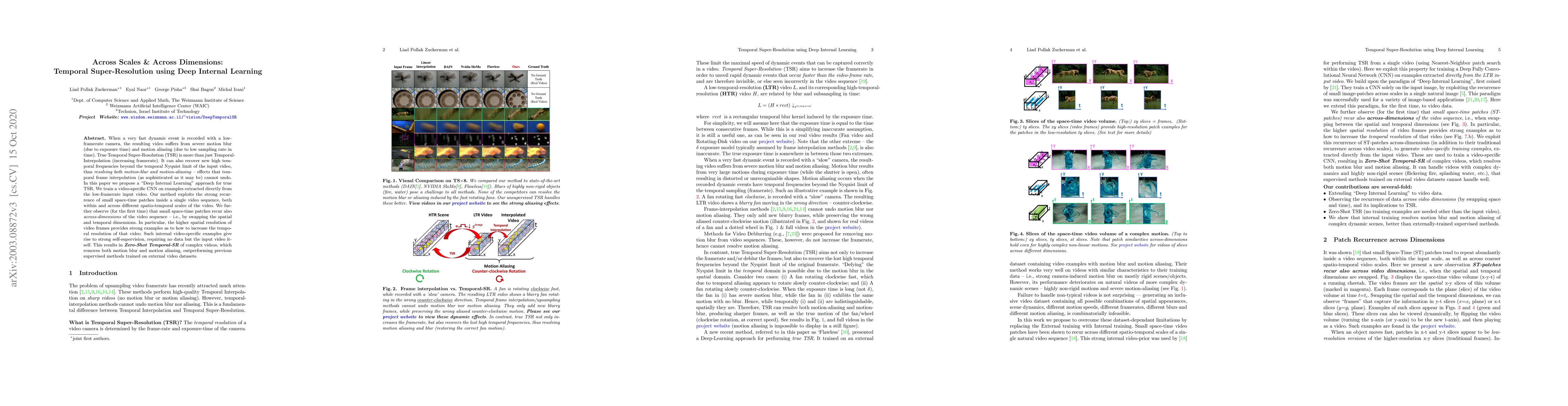 This paper proposes a "Deep Internal Learning" approach for True Temporal Super-Resolution (TSR) that leverages self-supervised learning from low-framerate input videos to recover high temporal frequencies, resolving motion blur and aliasing. The method trains a video-specific CNN on space-time patches, exploiting recurrence across spatio-temporal scales and dimensions, leading to superior Zero-Shot Temporal-SR performance.
