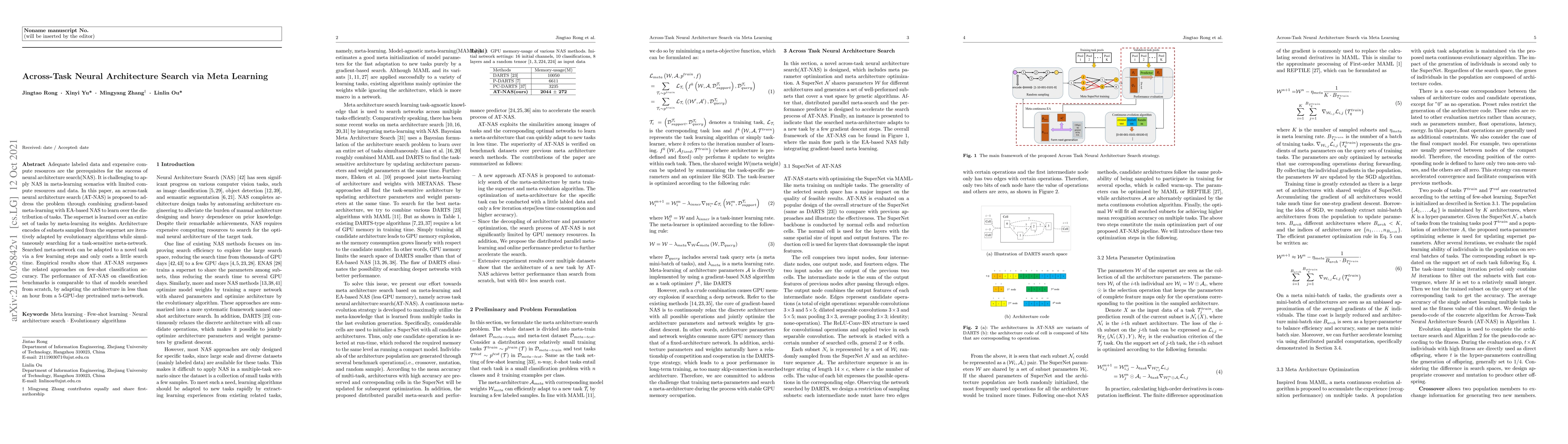 This paper proposes an across-task neural architecture search (AT-NAS) method that combines gradient-based meta-learning with evolutionary algorithms to optimize neural architectures under limited data and compute resources. AT-NAS achieves superior few-shot classification accuracy and adapts architectures efficiently from a pretrained meta-network.