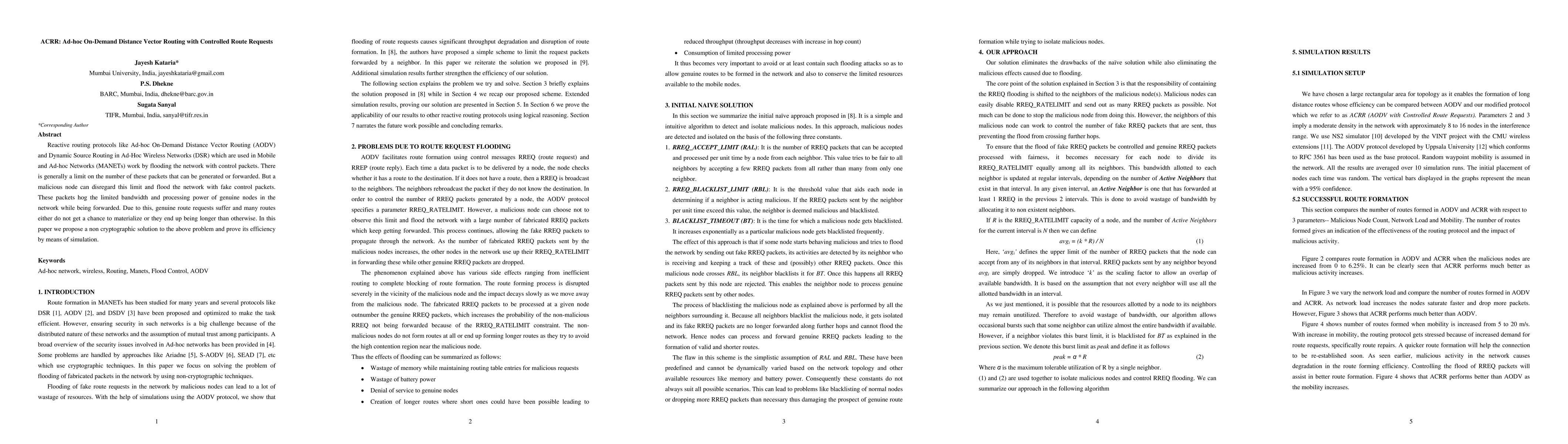 Title: ACRR: Ad Hoc On-Demand Distance Vector Routing with Controlled Route Requests Summary: This paper proposes ACRR, a non-cryptographic solution to mitigate the issue of malicious nodes flooding Ad-Hoc Wireless Networks with fake control packets, thereby improving route request efficiency and reducing network congestion through controlled route requests. Simulation results demonstrate its effectiveness.