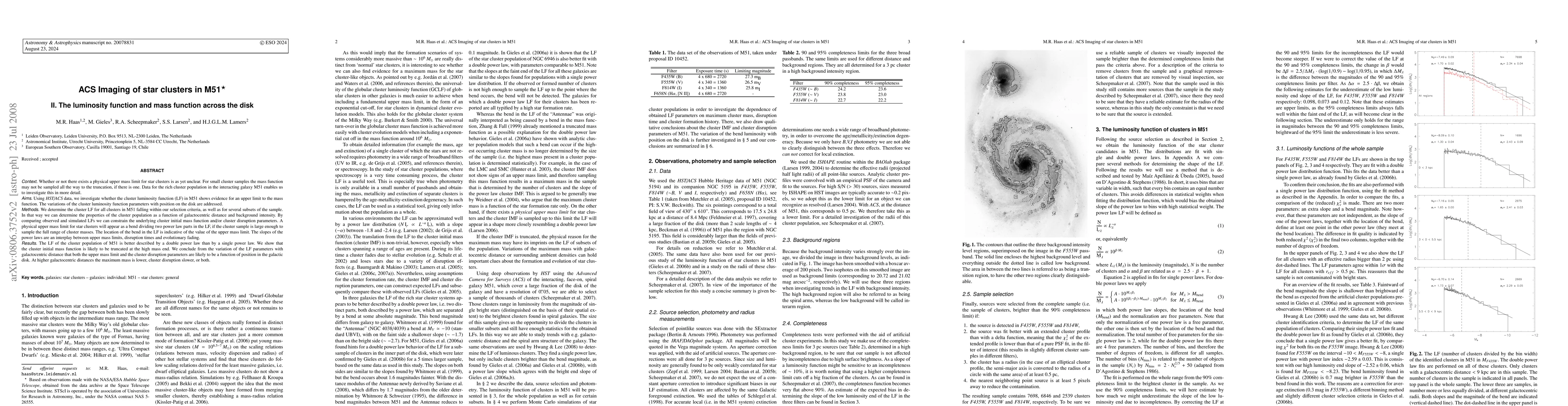Whether or not there exists a physical upper mass limit for star clusters is still unclear. HST/ACS data for the rich cluster population in the interacting galaxy M51 enables us to investigate this in more detail. We investigate whether the cluster luminosity function (LF) in M51 shows evidence for an upper limit to the mass function. The variations of the LF parameters with position on the disk are addressed. We determine the cluster LF for all clusters in M51 falling within our selection criteria, as well as for several subsets of the sample. In that way we can determine the properties of the cluster population as a function of galactocentric distance and background intensity. By comparing observed and simulated LFs we can constrain the underlying cluster initial mass function and/or cluster disruption parameters. A physical upper mass limit for star clusters will appear as a bend dividing two power law parts in the LF, if the cluster sample is large enough to sample the full range of cluster masses. The location of the bend in the LF is indicative of the value of the upper mass limit. The slopes of the power laws are an interplay between upper masses, disruption and fading. The LF of the cluster population of M51 is better described by a double power law than by a single power law. We show that the cluster initial mass function is likely to be truncated at the high mass end. We conclude from the variation of the LF parameters with galactocentric distance that both the upper mass limit and the cluster disruption parameters are likely to be a function of position in the galactic disk. At higher galactocentric distances the maximum mass is lower, cluster disruption slower, or both.