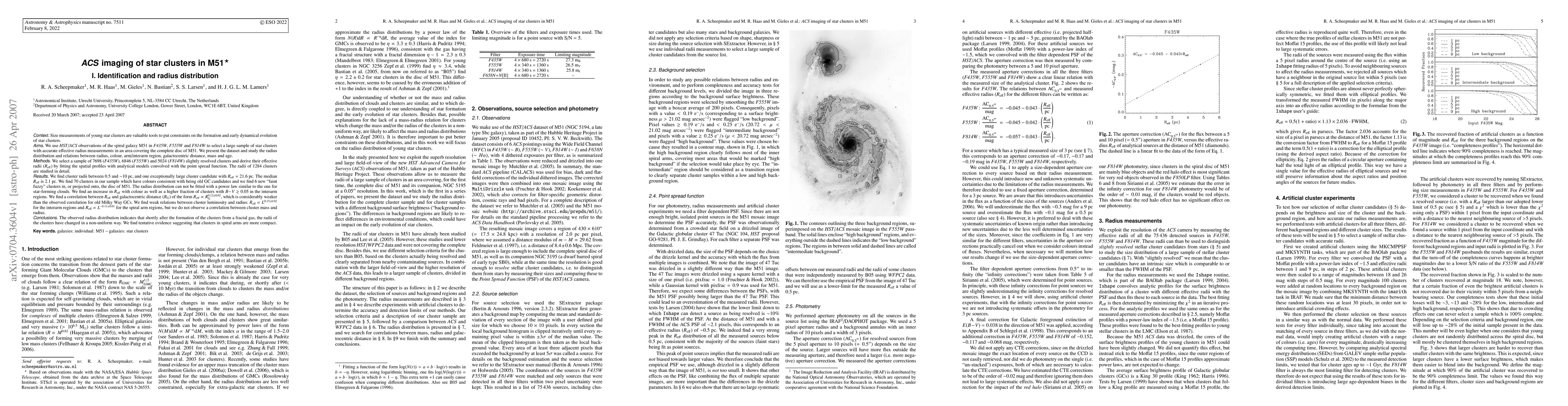 We use HST/ACS observations of the spiral galaxy M51 in F435W, F555W and F814W to select a large sample of star clusters with accurate effective radius measurements in an area covering the complete disc of M51. We present the dataset and study the radius distribution and relations between radius, colour, arm/interarm region, galactocentric distance, mass and age. We select a sample of 7698 (F435W), 6846 (F555W) and 5024 (F814W) slightly resolved clusters and derive their effective radii by fitting the spatial profiles with analytical models convolved with the point spread function. The radii of 1284 clusters are studied in detail. We find cluster radii between 0.5 and ~10 pc, and one exceptionally large cluster candidate with a radius of 21.6 pc. The median radius is 2.1 pc. We find 70 clusters in our sample which have colours consistent with being old GC candidates and we find 6 new "faint fuzzy" clusters in, or projected onto, the disc of M51. The radius distribution can not be fitted with a power law, but a log-normal distribution provides a reasonable fit to the data. This indicates that shortly after the formation of the clusters from a fractal gas, their radii have changed in a non-uniform way. We find an increase in radius with colour as well as a higher fraction of redder clusters in the interarm regions, suggesting that clusters in spiral arms are more compact. We find a correlation between radius and galactocentric distance which is considerably weaker than the observed correlation for old Milky Way GCs. We find weak relations between cluster luminosity and radius, but we do not observe a correlation between cluster mass and radius.