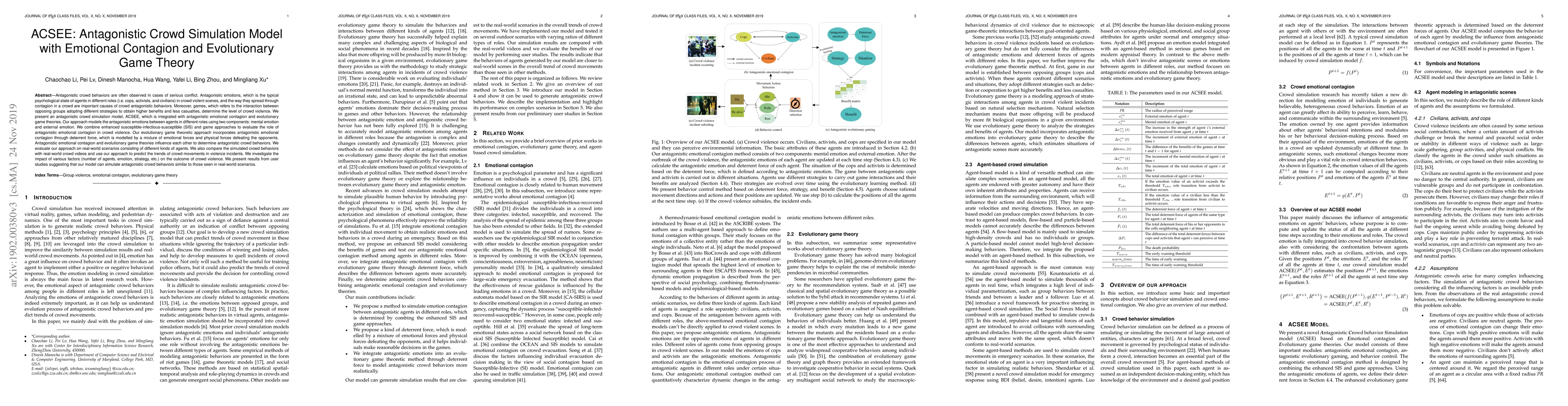 The ACSEE model integrates antagonistic emotional contagion and evolutionary game theory to simulate crowd behaviors in conflict scenarios. It evaluates how emotional and physical forces influence crowd violence, comparing simulated behaviors against real-world crowd videos and predicting crowd movement trends.