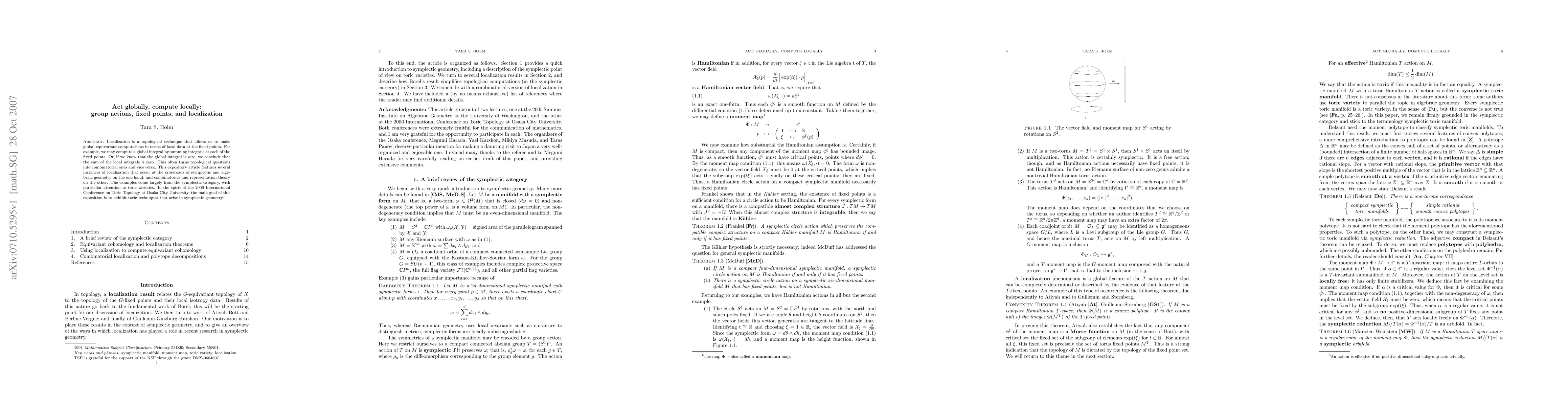 Localization is a topological technique that allows us to make global equivariant computations in terms of local data at the fixed points. For example, we may compute a global integral by summing integrals at each of the fixed points. Or, if we know that the global integral is zero, we conclude that the sum of the local integrals is zero. This often turns topological questions into combinatorial ones and vice versa. This expository article features several instances of localization that occur at the crossroads of symplectic and algebraic geometry on the one hand, and combinatorics and representation theory on the other. The examples come largely from the symplectic category, with particular attention to toric varieties. In the spirit of the 2006 International Conference on Toric Topology at Osaka City University, the main goal of this exposition is to exhibit toric techniques that arise in symplectic geometry.