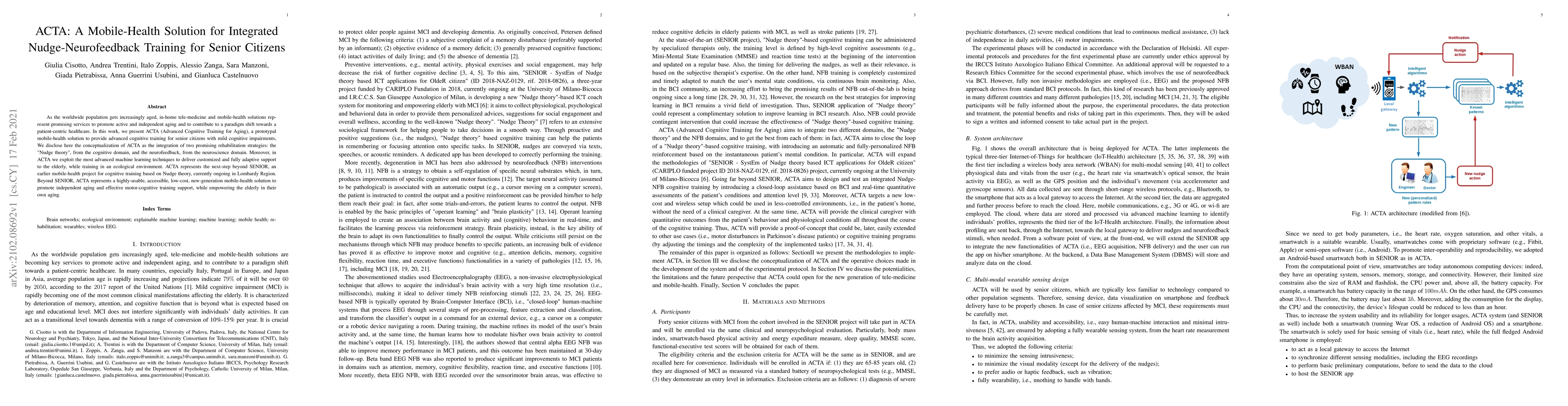 As the worldwide population gets increasingly aged, in-home telemedicine and mobile-health solutions represent promising services to promote active and independent aging and to contribute to a paradigm shift towards patient-centric healthcare. In this work, we present ACTA (Advanced Cognitive Training for Aging), a prototype mobile-health solution to provide advanced cognitive training for senior citizens with mild cognitive impairments. We disclose here the conceptualization of ACTA as the integration of two promising rehabilitation strategies: the "Nudge theory", from the cognitive domain, and the neurofeedback, from the neuroscience domain. Moreover, in ACTA we exploit the most advanced machine learning techniques to deliver customized and fully adaptive support to the elderly, while training in an ecological environment. ACTA represents the next-step beyond SENIOR, an earlier mobile-health project for cognitive training based on Nudge theory, currently ongoing in Lombardy Region. Beyond SENIOR, ACTA represents a highly-usable, accessible, low-cost, new-generation mobile-health solution to promote independent aging and effective motor-cognitive training support, while empowering the elderly in their own aging.