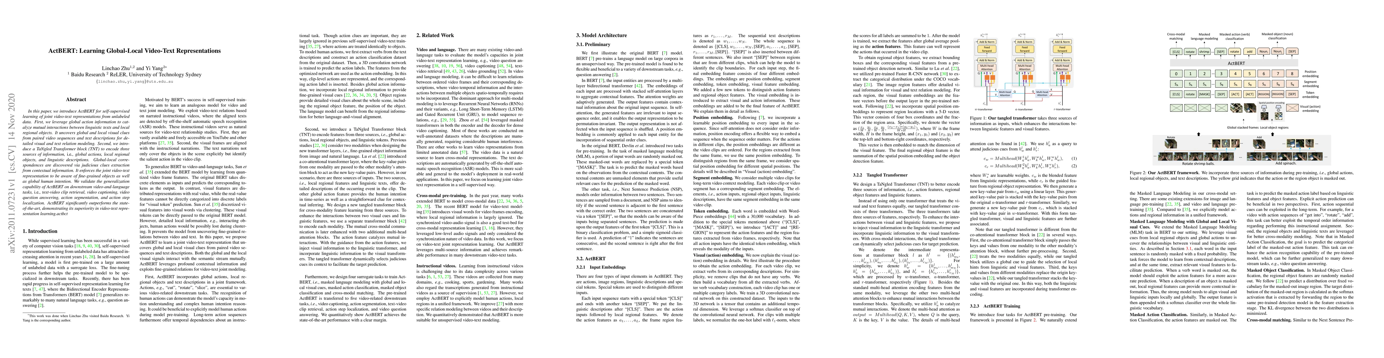 ActBERT introduces a self-supervised method for learning joint video-text representations by leveraging global action information and an ENtangled Transformer block to encode global actions, local objects, and text. It outperforms state-of-the-art methods in various video-language tasks.