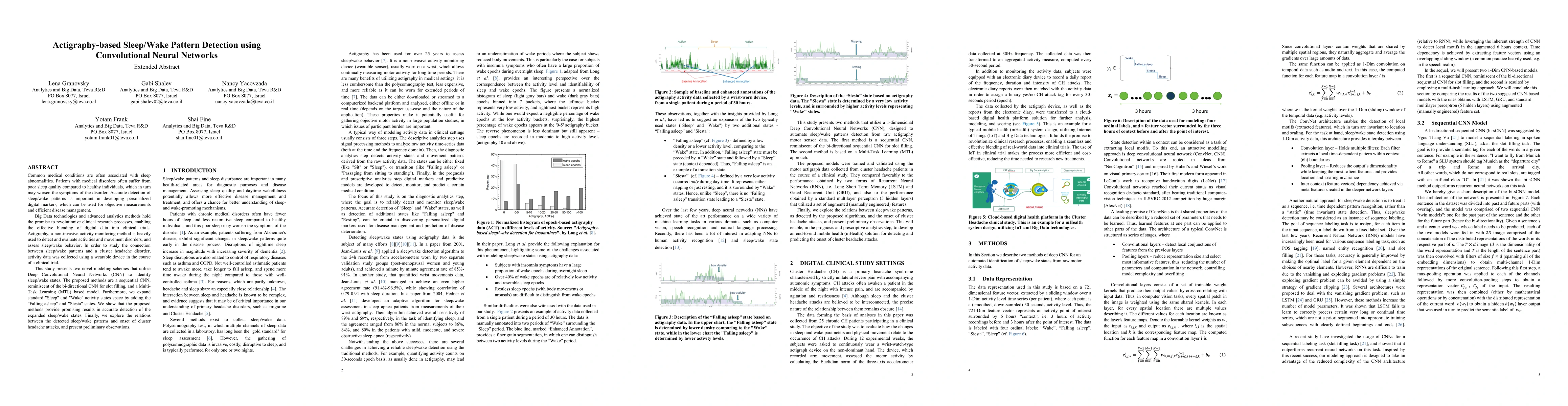 Common medical conditions are often associated with sleep abnormalities. Patients with medical disorders often suffer from poor sleep quality compared to healthy individuals, which in turn may worsen the symptoms of the disorder. Accurate detection of sleep/wake patterns is important in developing personalized digital markers, which can be used for objective measurements and efficient disease management. Big Data technologies and advanced analytics methods hold the promise to revolutionize clinical research processes, enabling the effective blending of digital data into clinical trials. Actigraphy, a non-invasive activity monitoring method is heavily used to detect and evaluate activities and movement disorders, and assess sleep/wake behavior. In order to study the connection between sleep/wake patterns and a cluster headache disorder, activity data was collected using a wearable device in the course of a clinical trial. This study presents two novel modeling schemes that utilize Deep Convolutional Neural Networks (CNN) to identify sleep/wake states. The proposed methods are a sequential CNN, reminiscent of the bi-directional CNN for slot filling, and a Multi-Task Learning (MTL) based model. Furthermore, we expand standard "Sleep" and "Wake" activity states space by adding the "Falling asleep" and "Siesta" states. We show that the proposed methods provide promising results in accurate detection of the expanded sleep/wake states. Finally, we explore the relations between the detected sleep/wake patterns and onset of cluster headache attacks, and present preliminary observations.