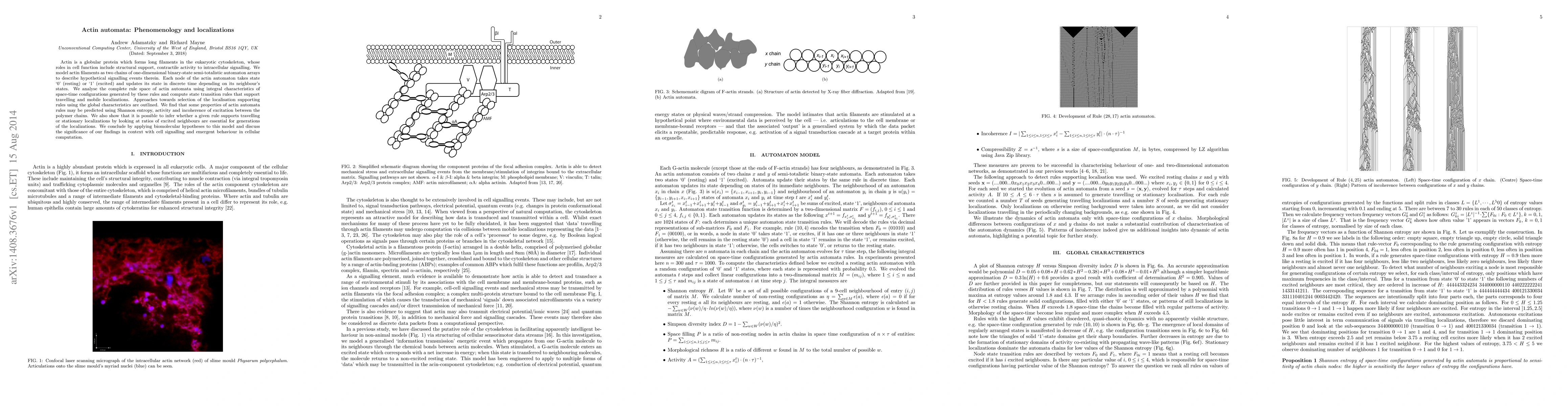 This paper models actin filaments as binary-state automata to explore hypothetical signalling events and computes rules supporting travelling and mobile localizations. It uses Shannon entropy and activity metrics to predict properties of these rules and discusses their implications for cellular computation and signalling.