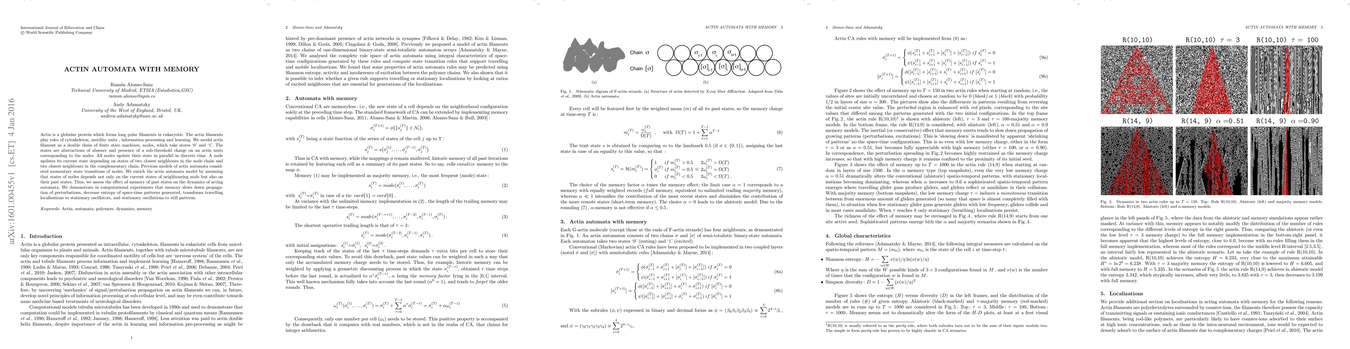 This paper models actin filaments as double-chain automata where nodes represent actin units, updating their states based on current and past states of neighboring nodes. The study finds that memory of past states slows down perturbation propagation, reduces entropy, and transforms dynamic patterns into stationary ones.